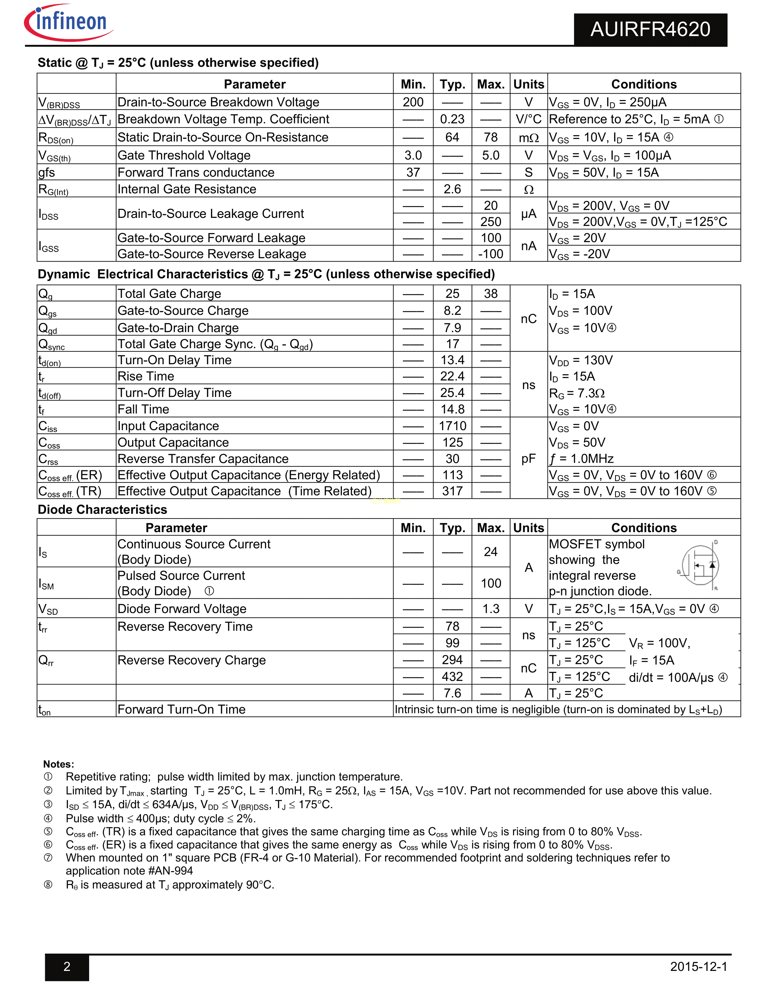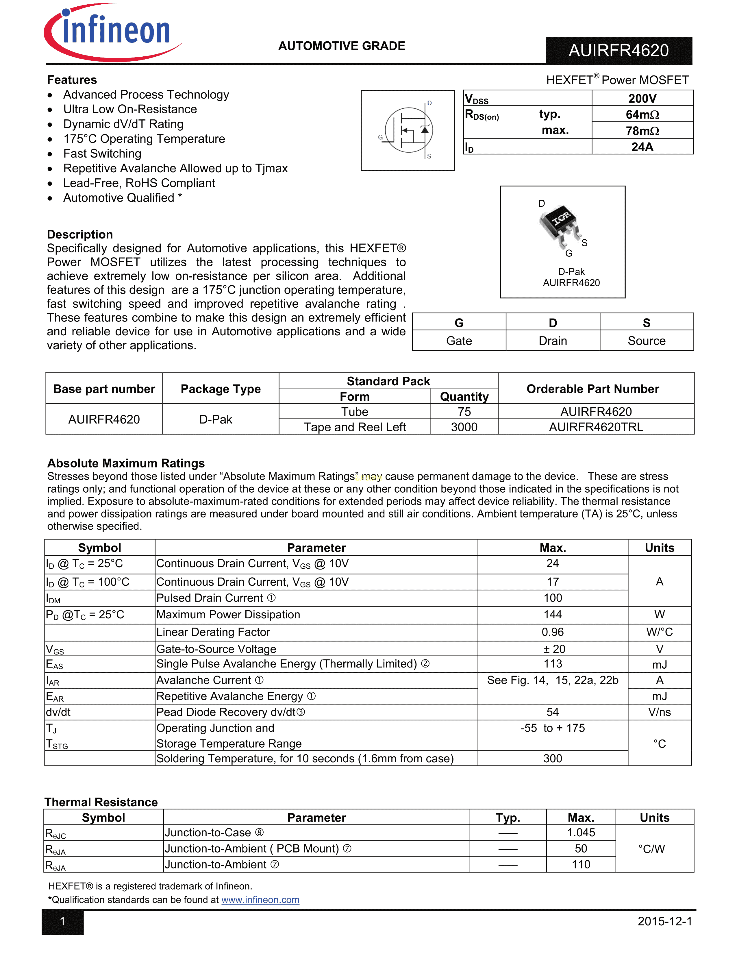 AUIRFR4620TRL数据手册DPAK封装Infineon(英飞凌)PDF规格书,中英文下载