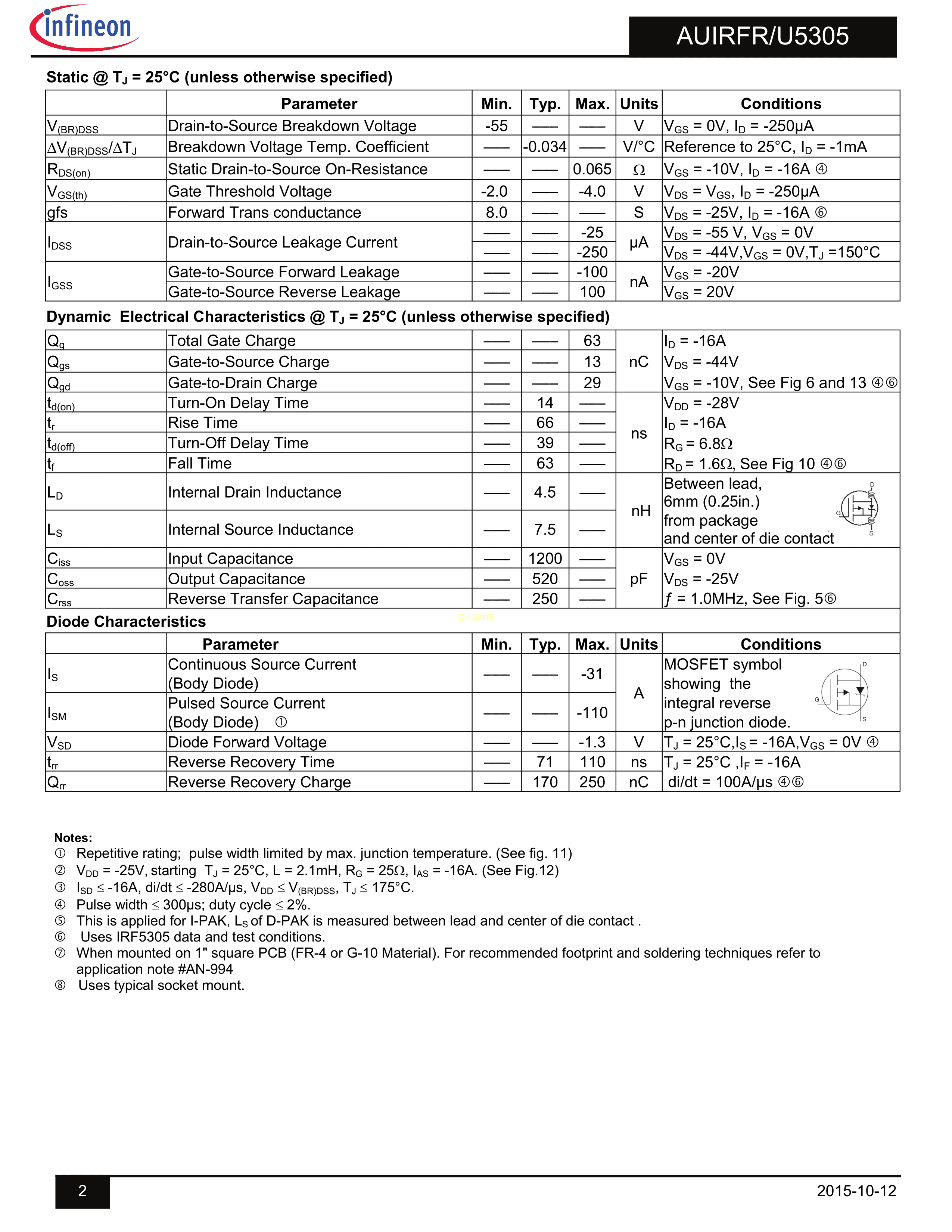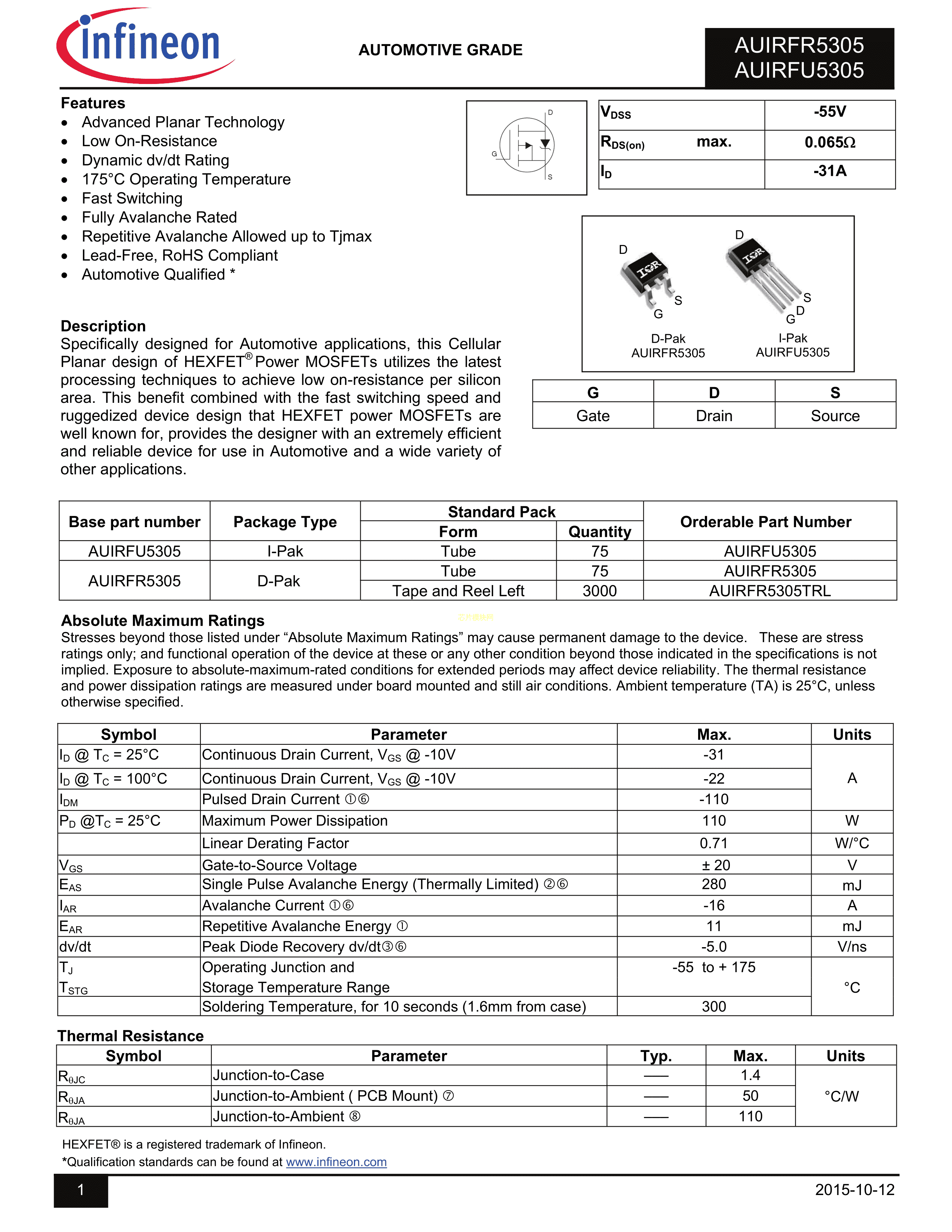 AUIRFR5305数据手册DPAK封装Infineon(英飞凌)PDF规格书,中英文下载