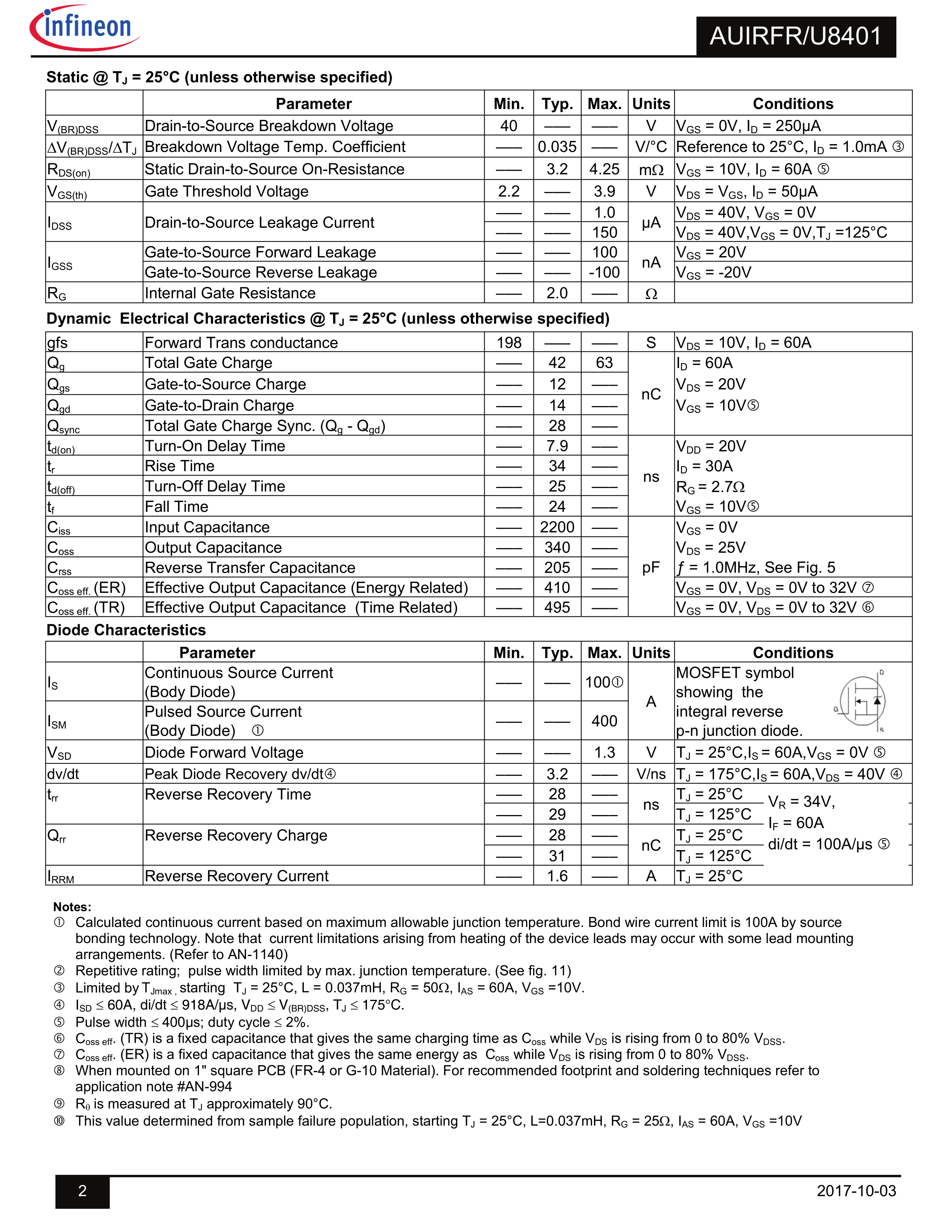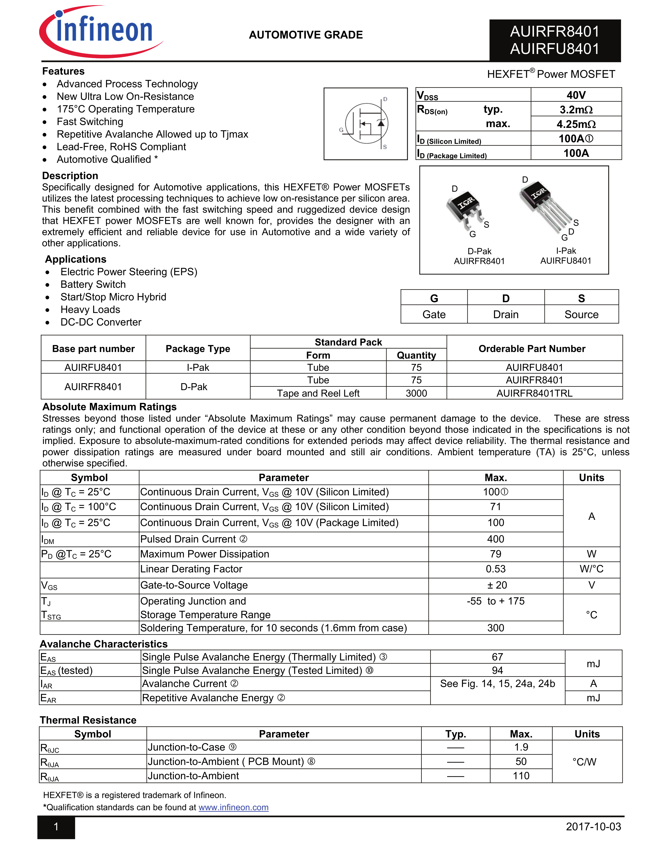AUIRFR8401数据手册DPAK封装Infineon(英飞凌)PDF规格书,中英文下载
