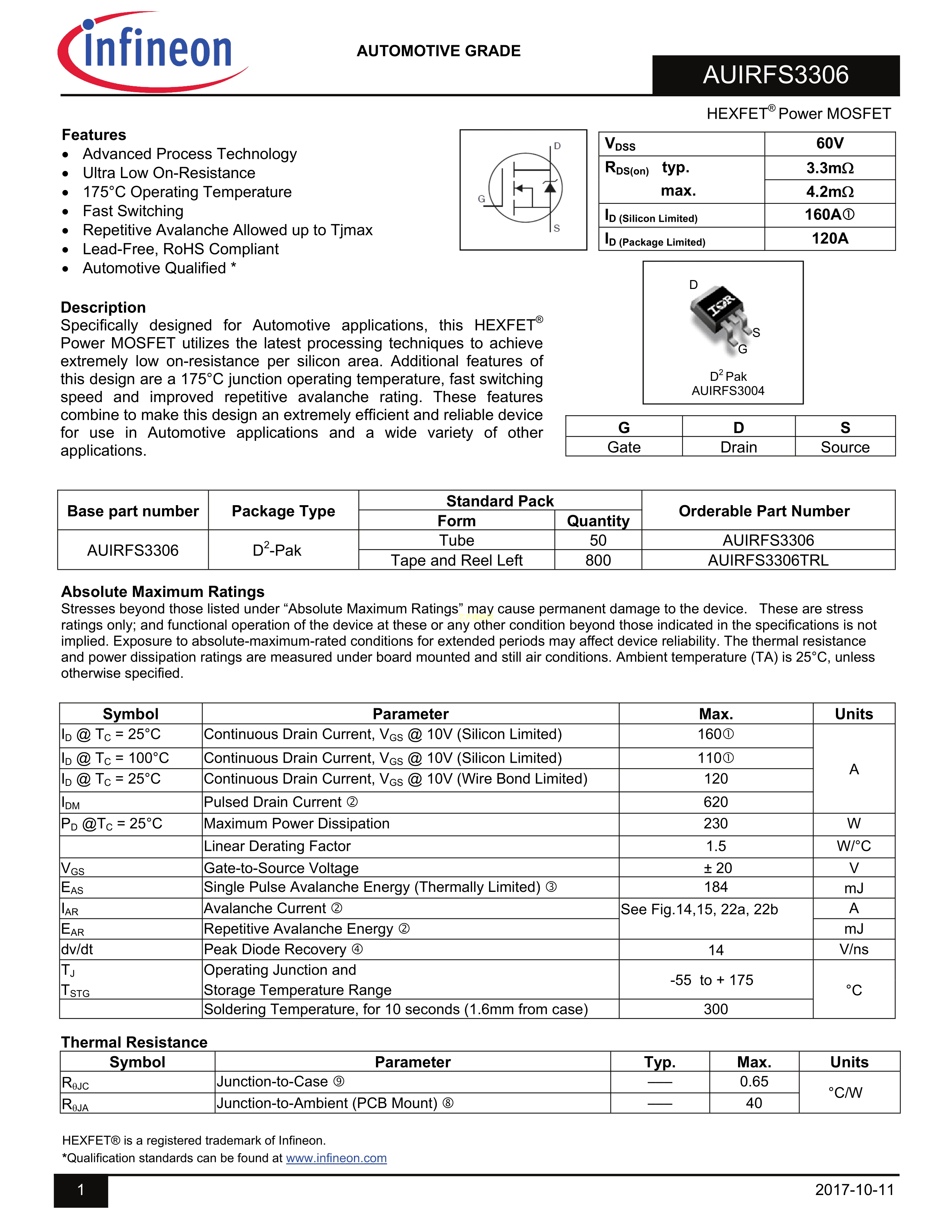 AUIRFS3306TRL数据手册D2PAK封装Infineon(英飞凌)PDF规格书,中英文下载