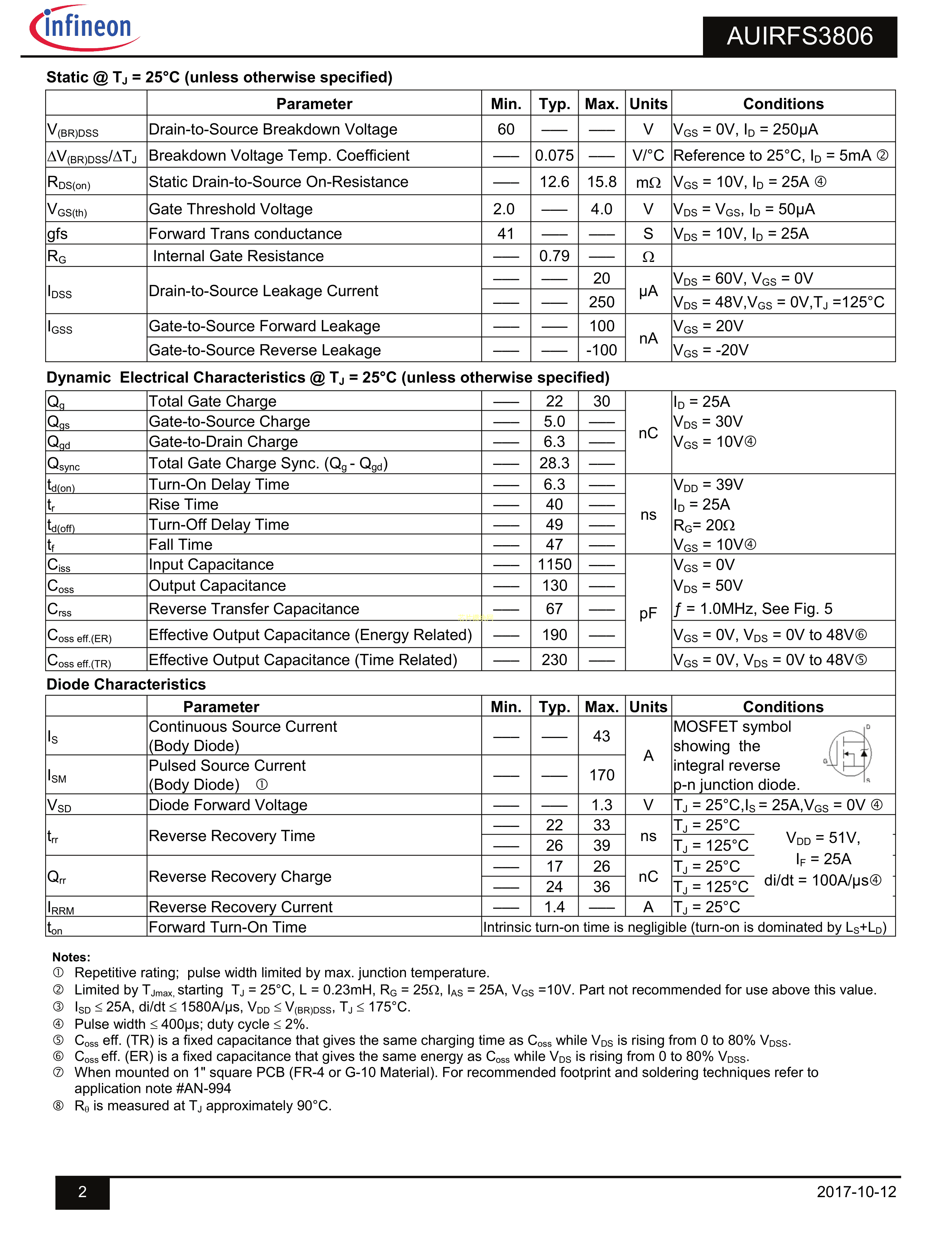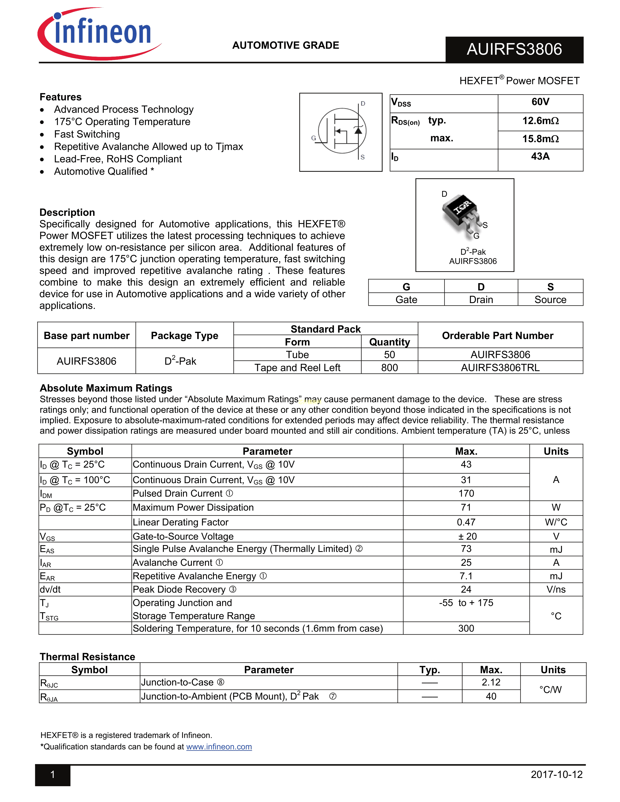 AUIRFS3806TRL数据手册D2PAK封装Infineon(英飞凌)PDF规格书,中英文下载