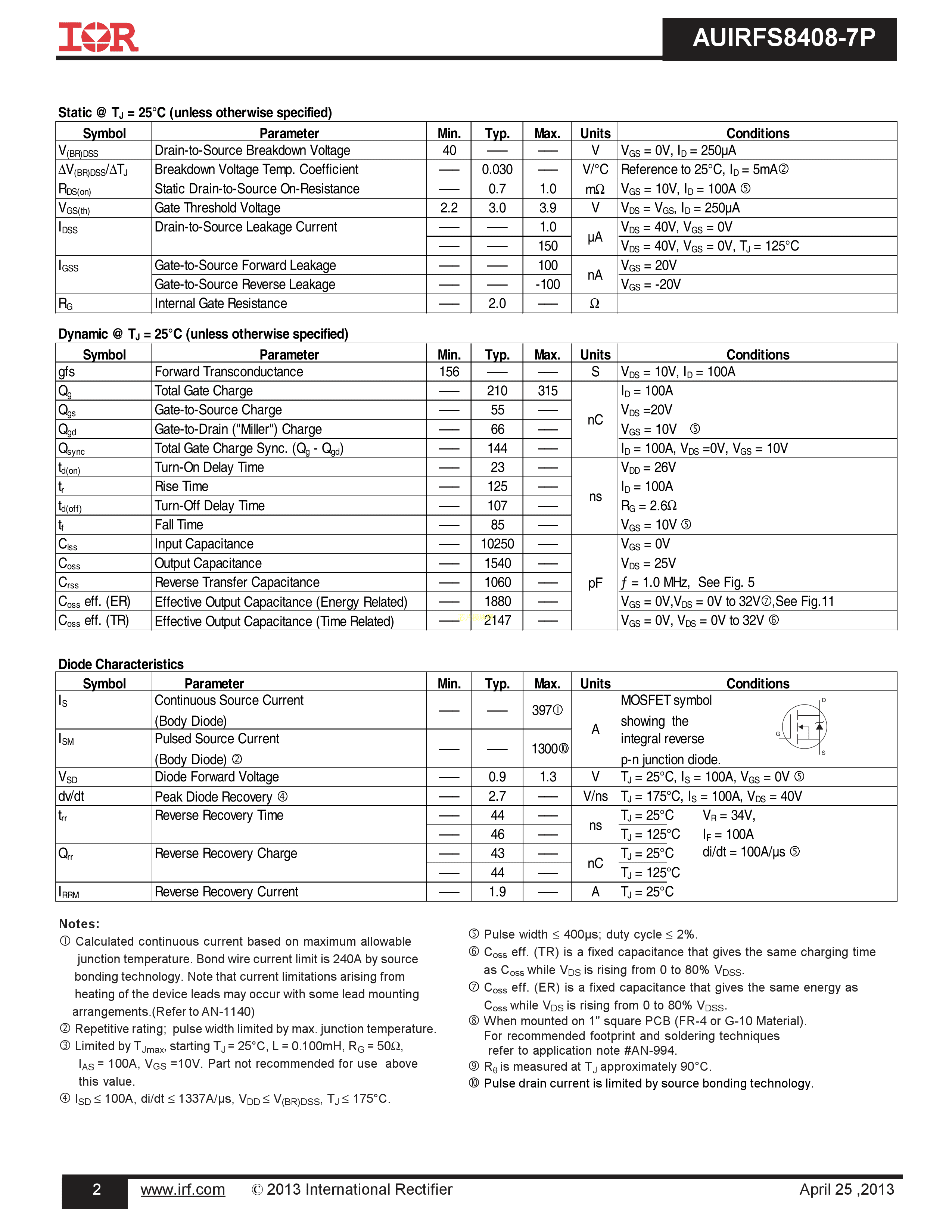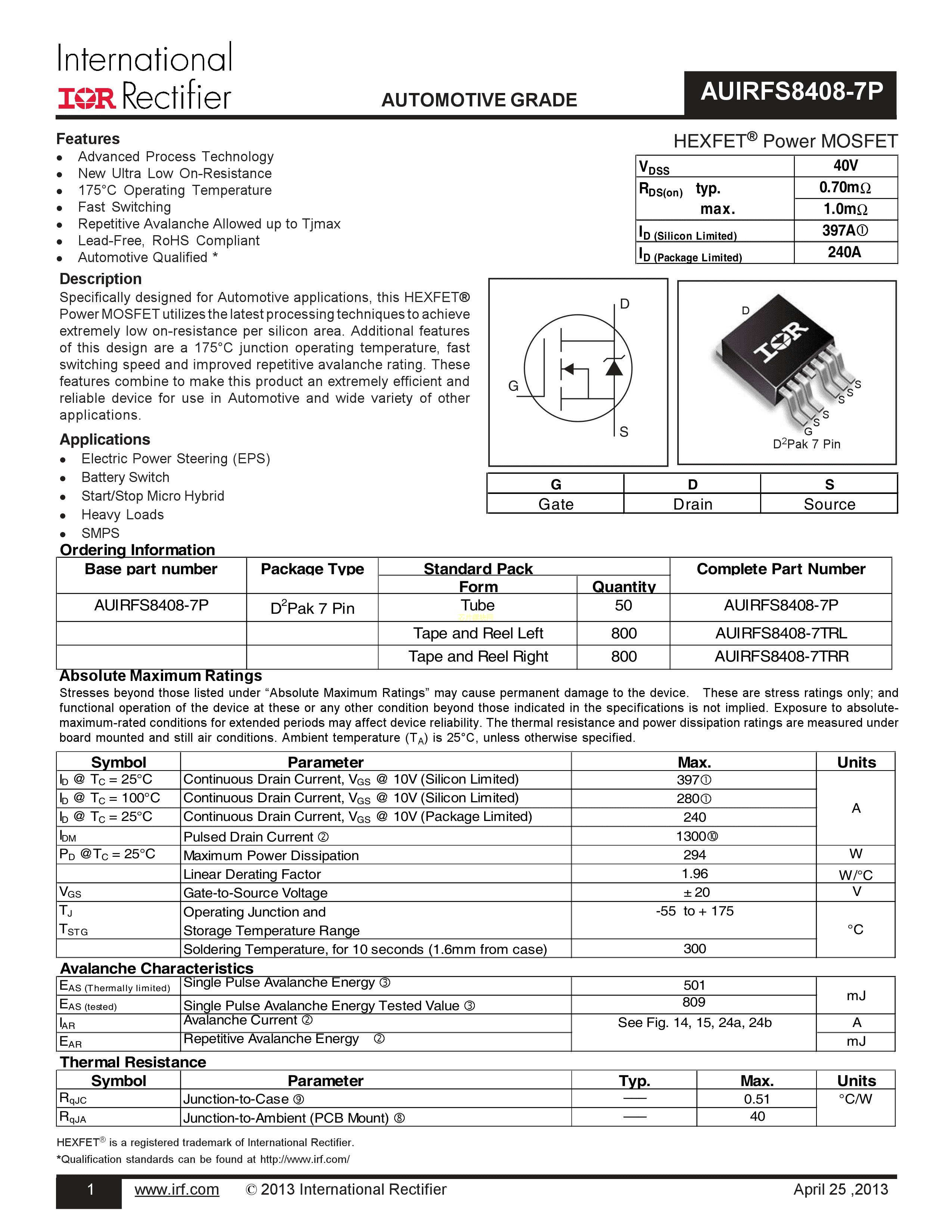 AUIRFS8408-7TRL数据手册D2PAK-7P封装Infineon(英飞凌)PDF规格书,中