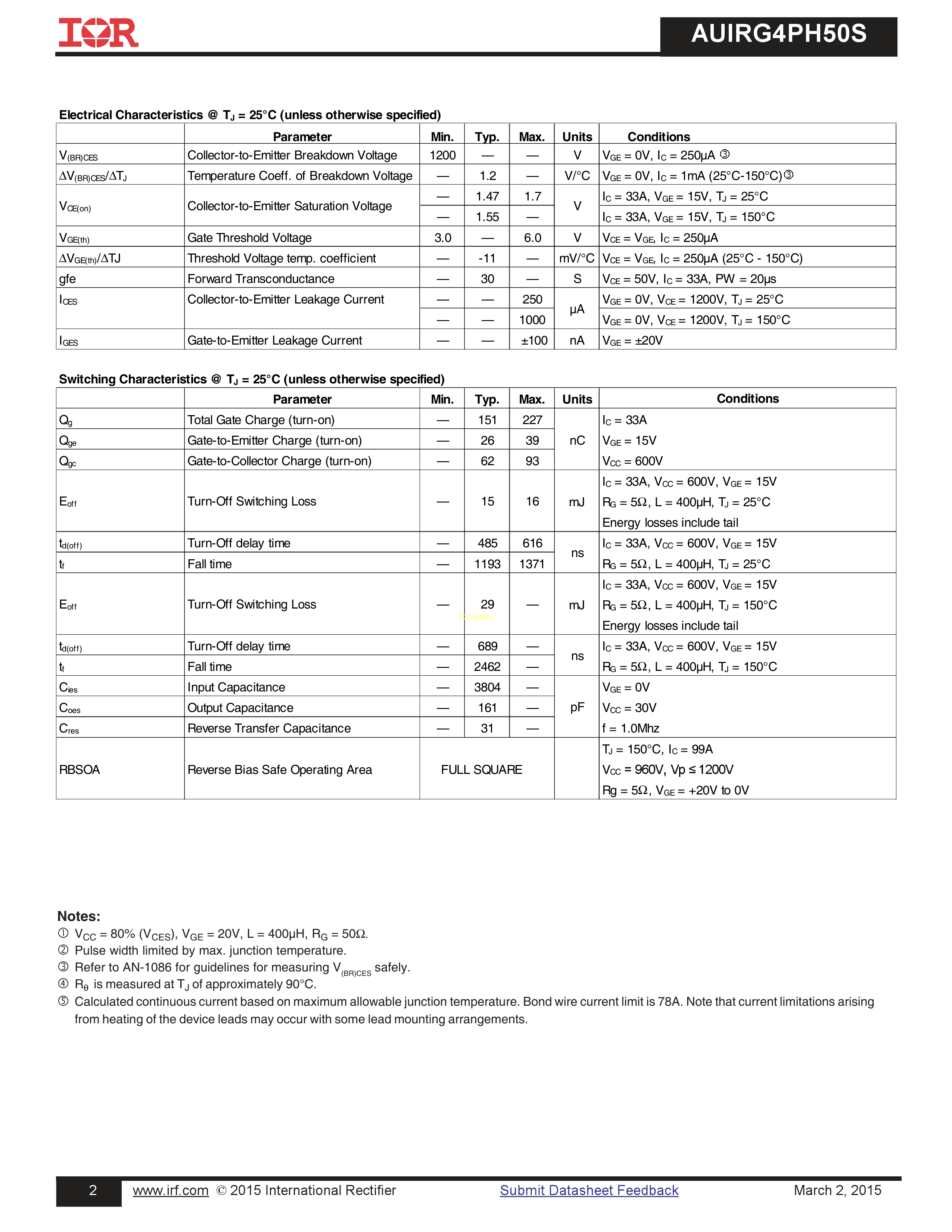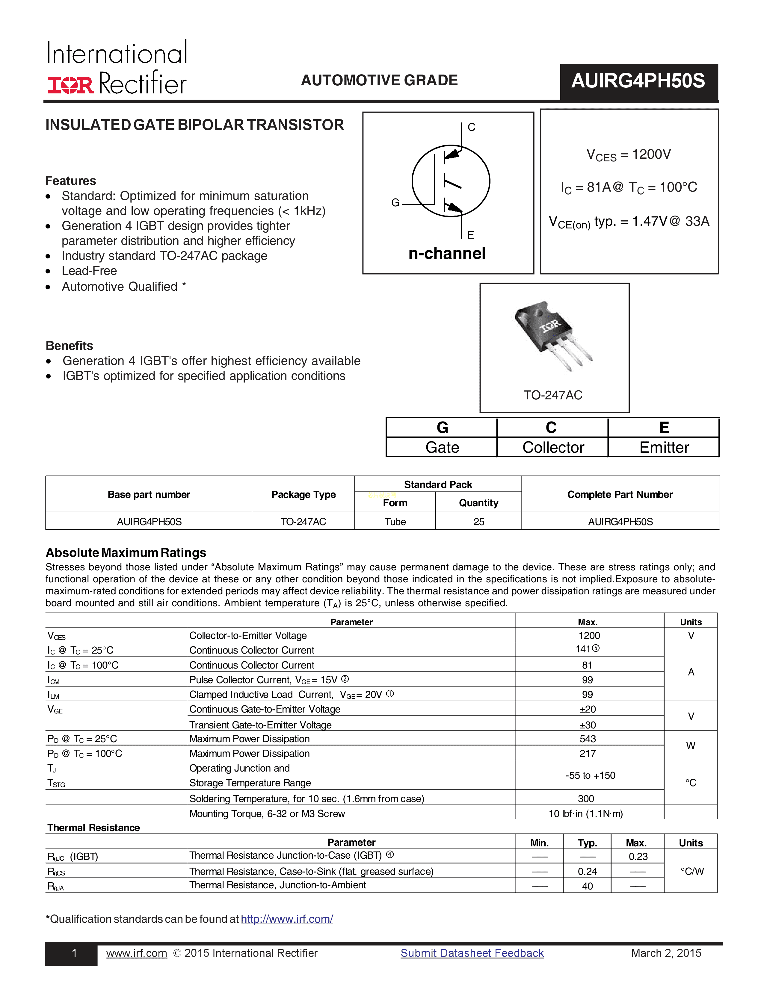 AUIRG4PH50S数据手册TO-247AC封装Infineon(英飞凌)PDF规格书,中英文下载
