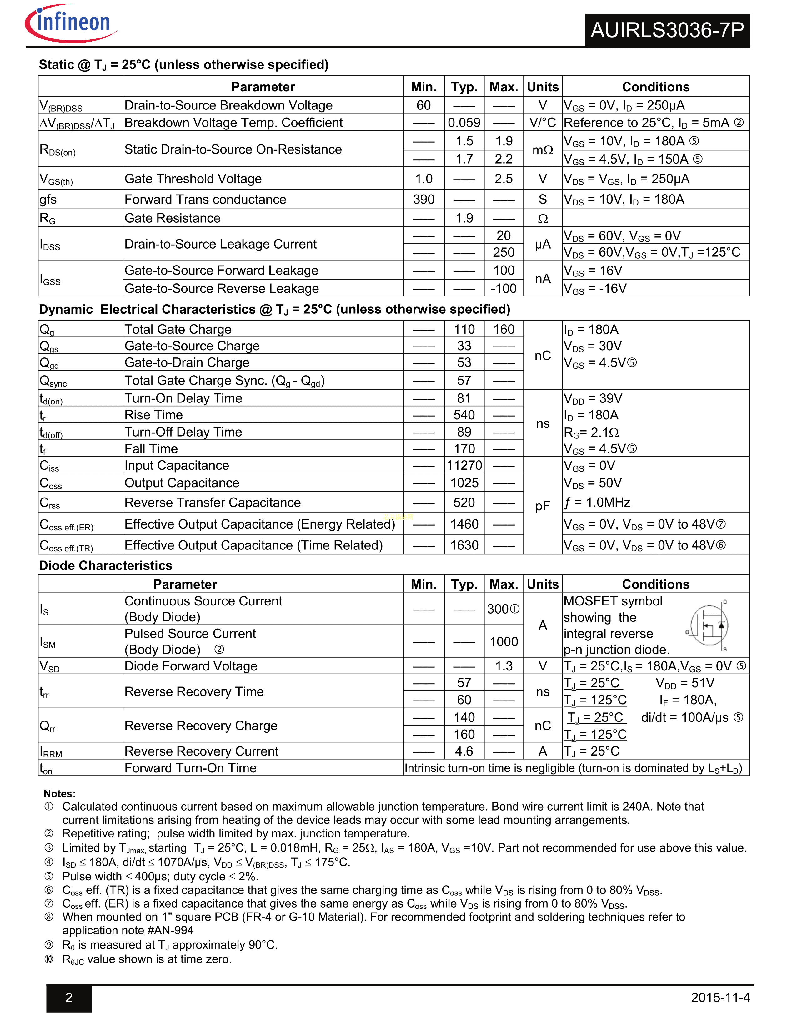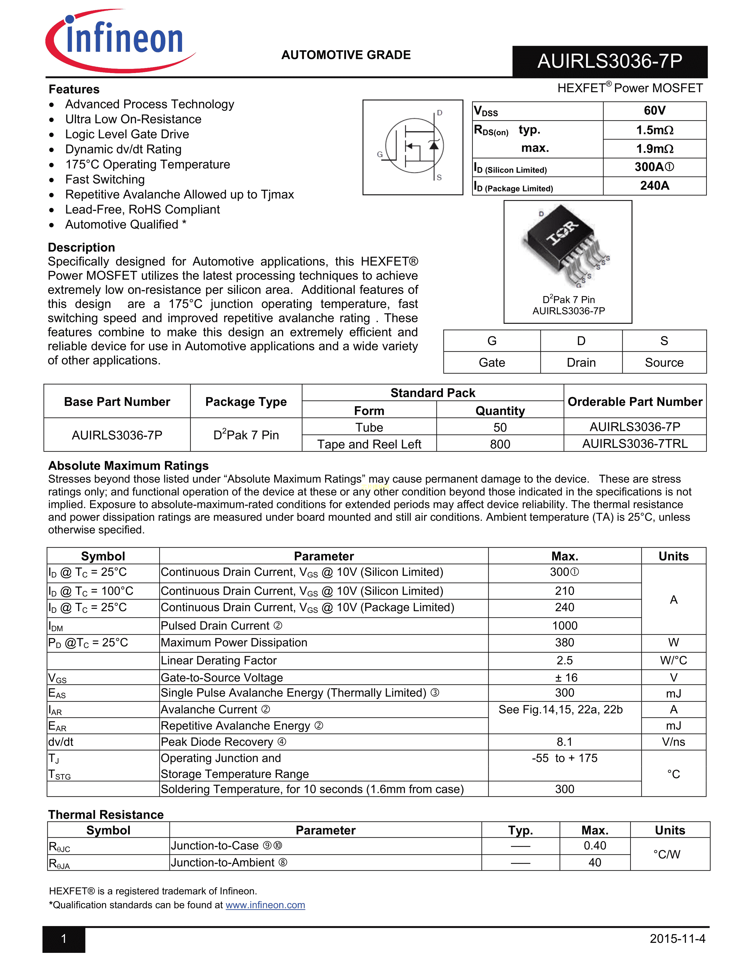AUIRLS3036-7TRL数据手册D2PAK-7P封装Infineon(英飞凌)PDF规格书,中