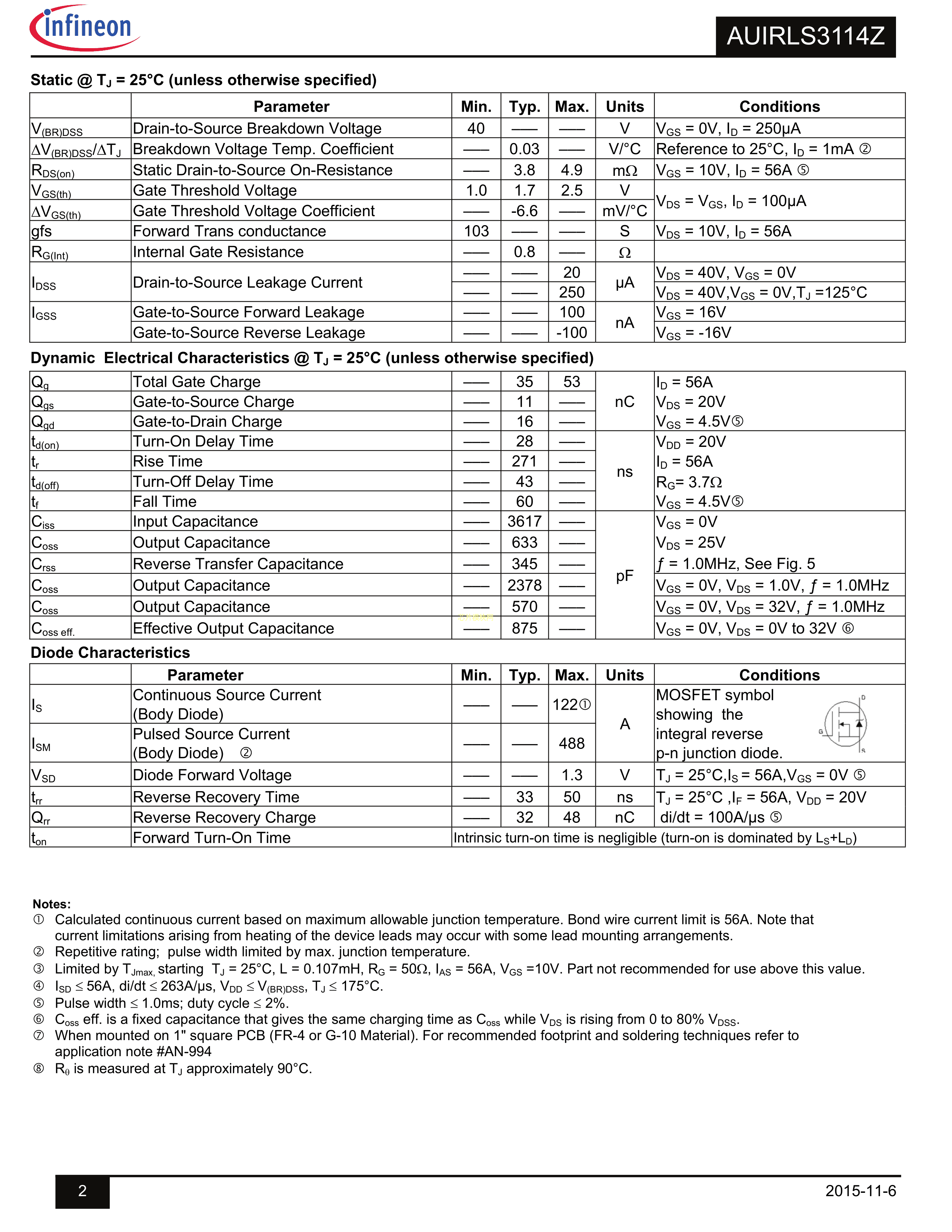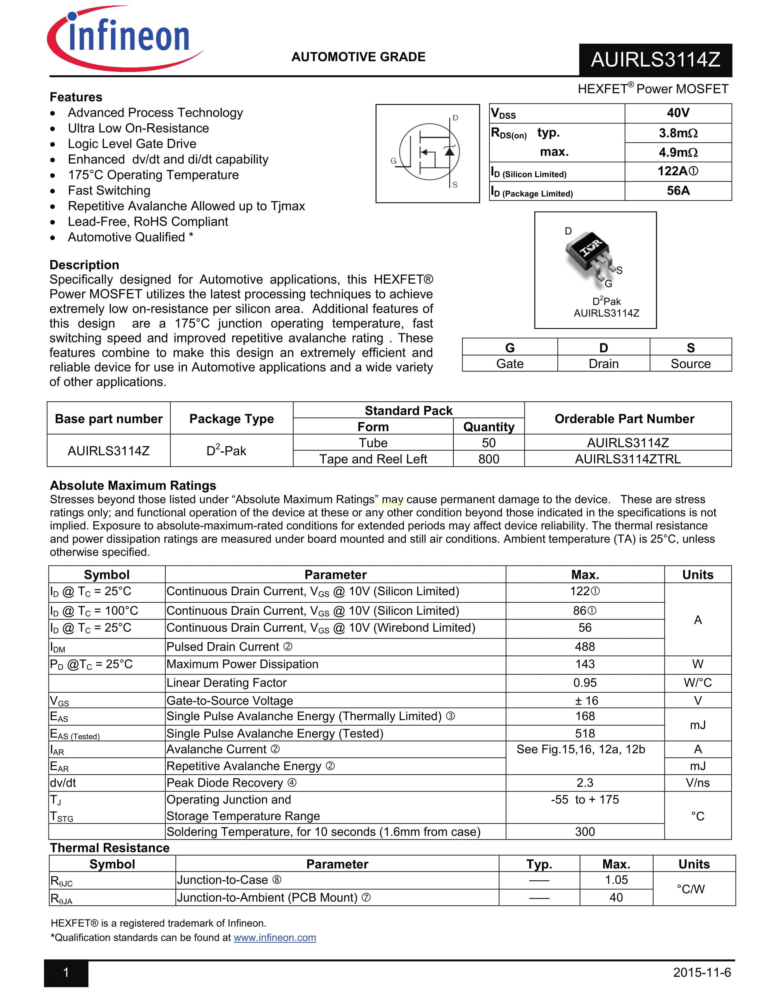 AUIRLS3114Z数据手册D2PAK封装Infineon(英飞凌)PDF规格书,中英文下载