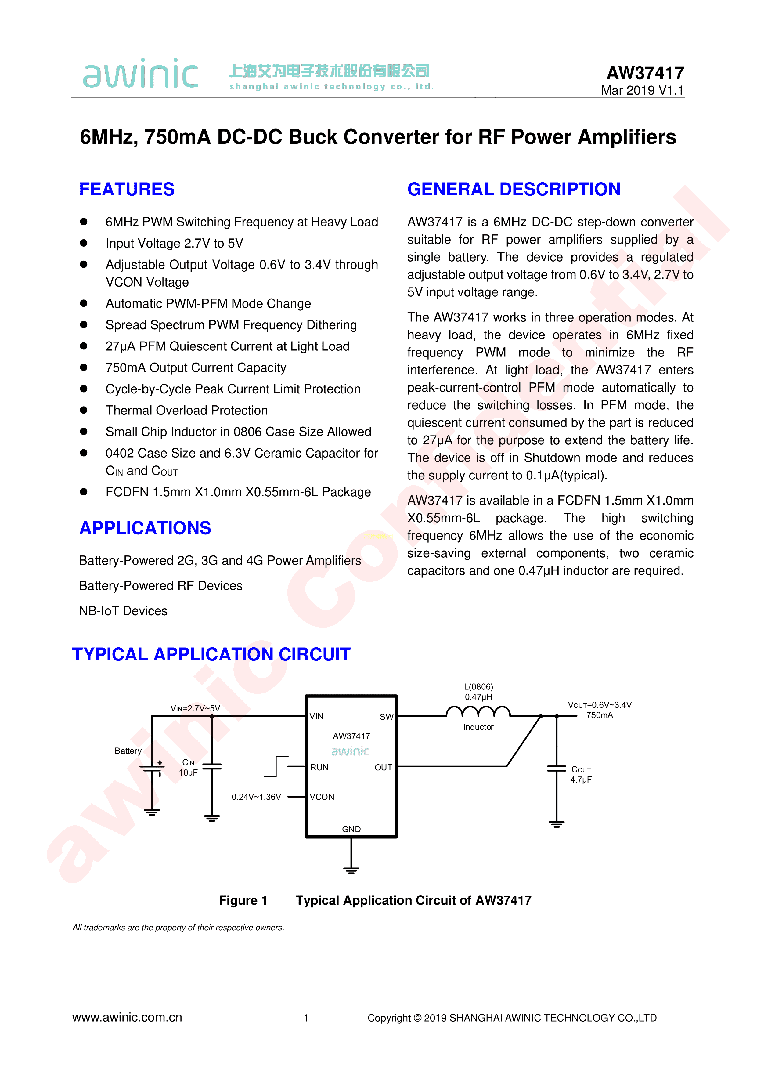AW37417FDR数据手册FCDFN-6L封装AWINIC(艾为)PDF规格书,中英文下载