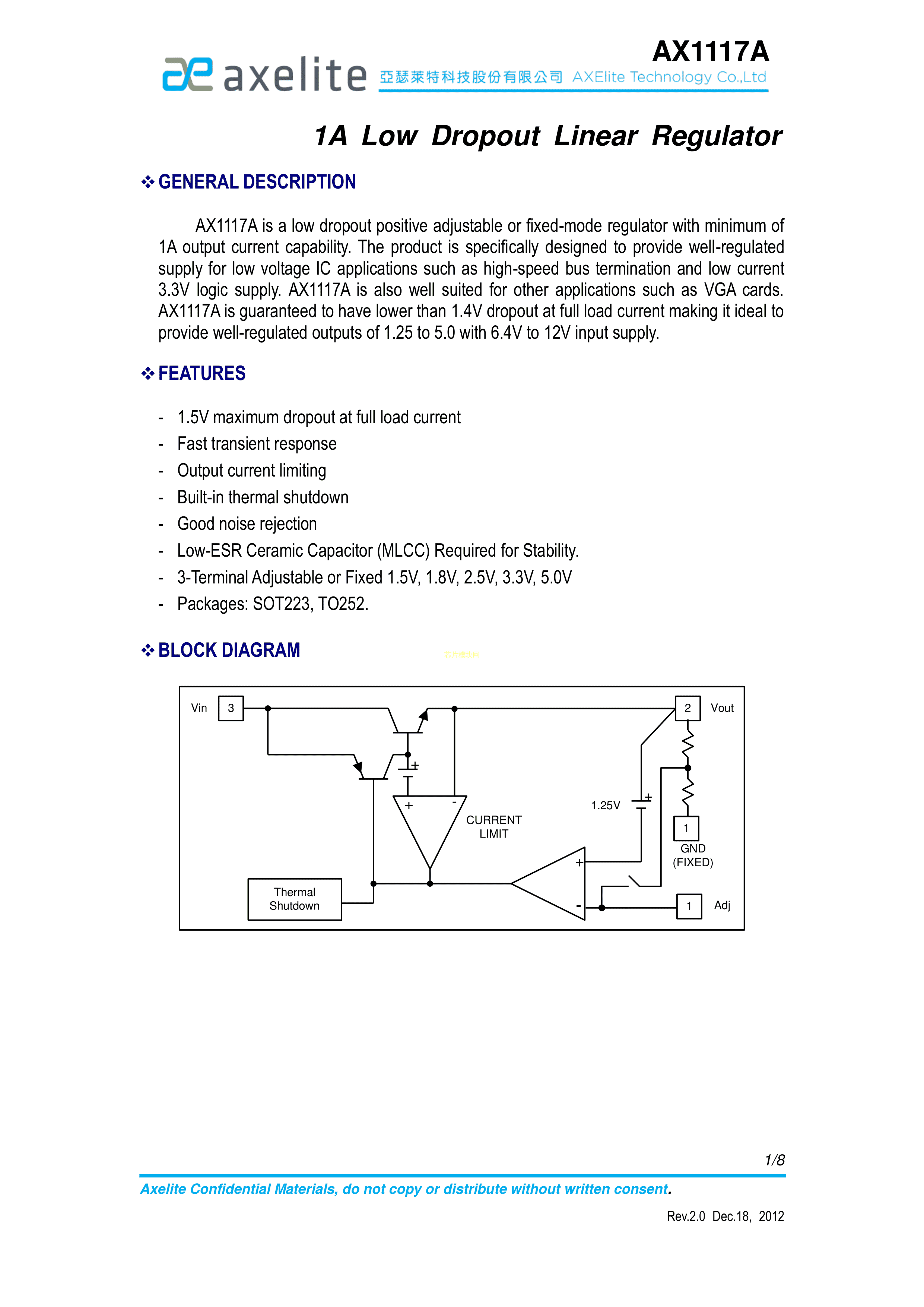 AX1117AE15A数据手册SOT-223-3L封装Axelite(台湾亚瑟莱特)PDF规格书,中