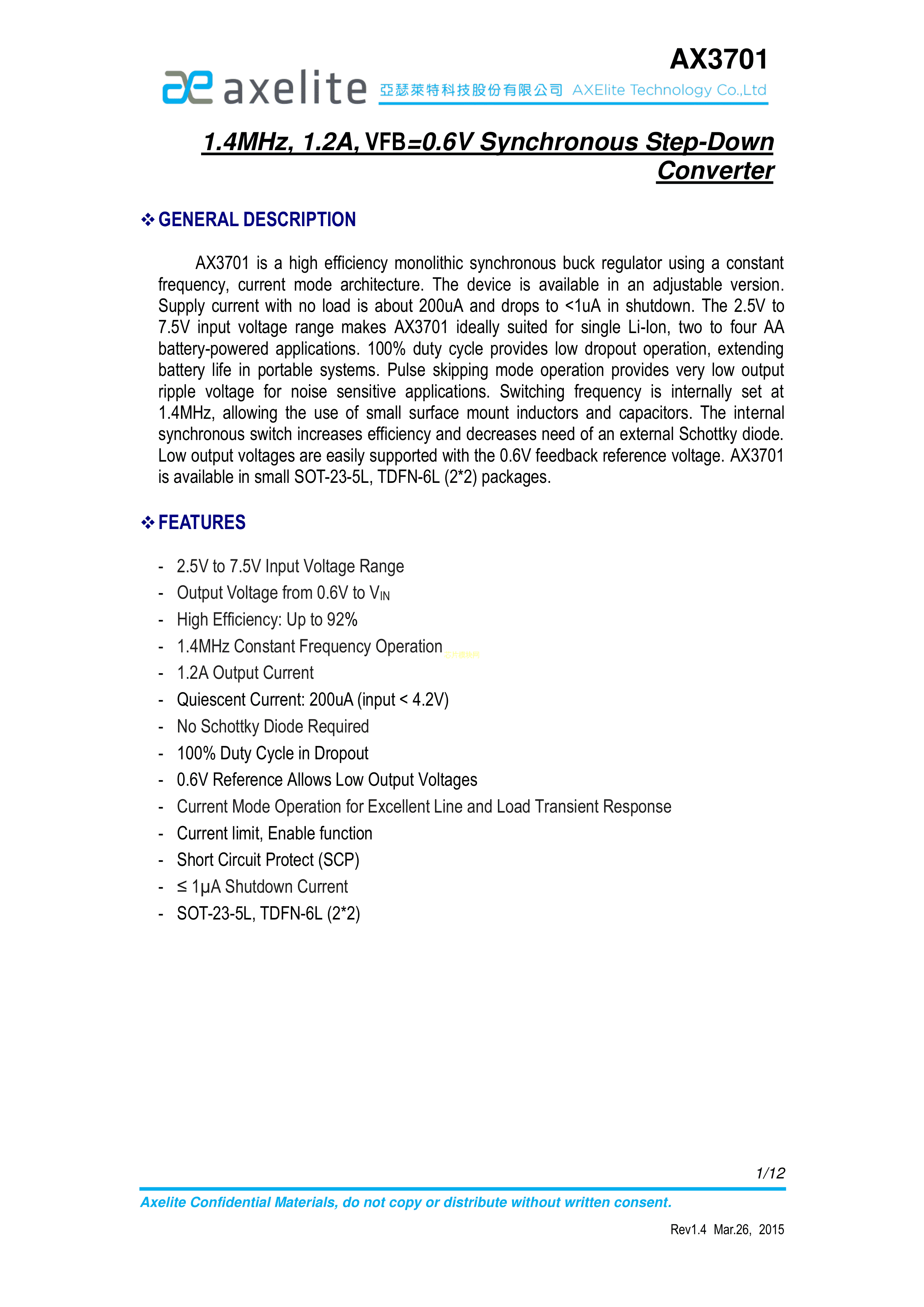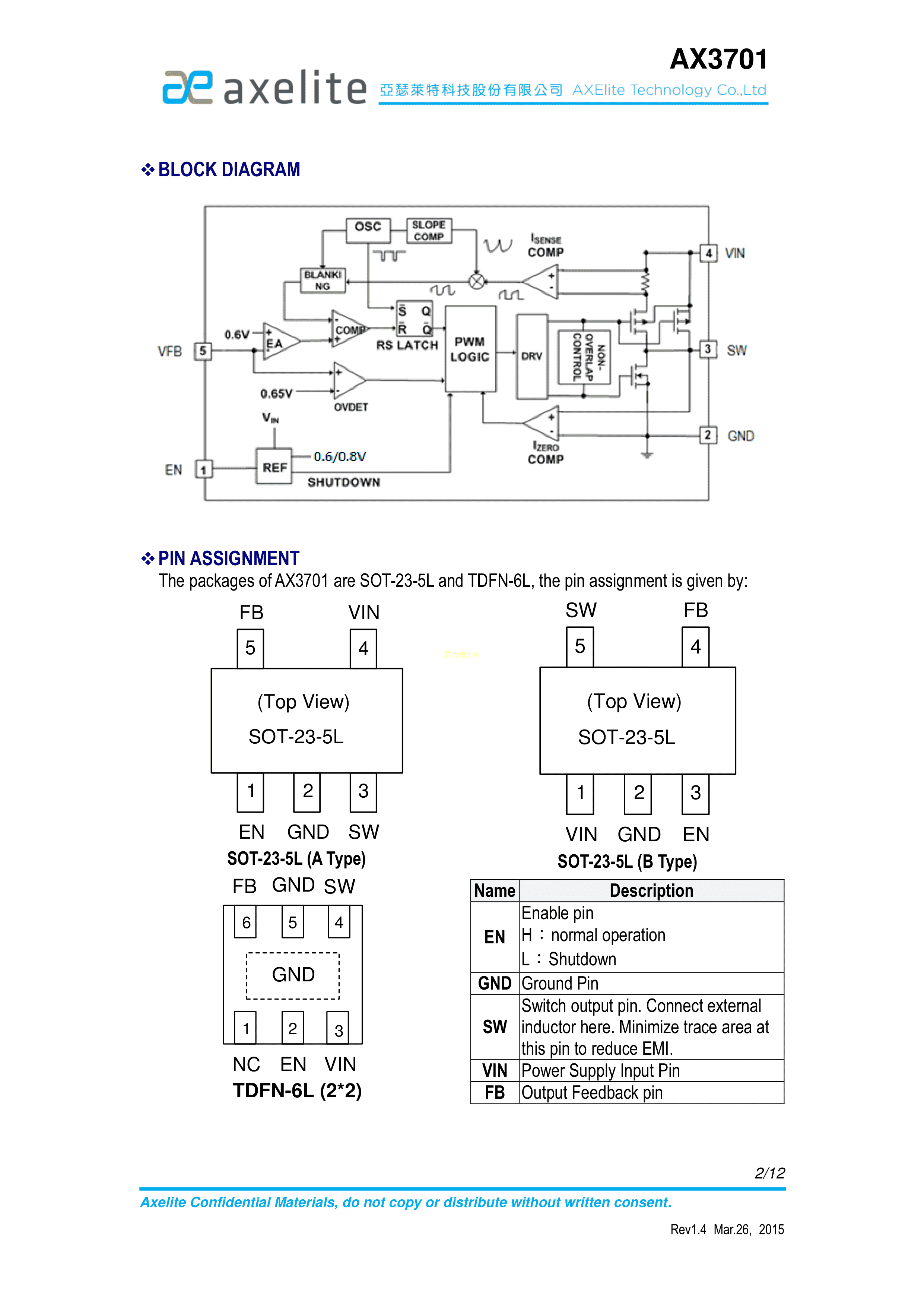 AX3701ABA数据手册SOT-23-5L封装Axelite(台湾亚瑟莱特)PDF规格书,中英文下