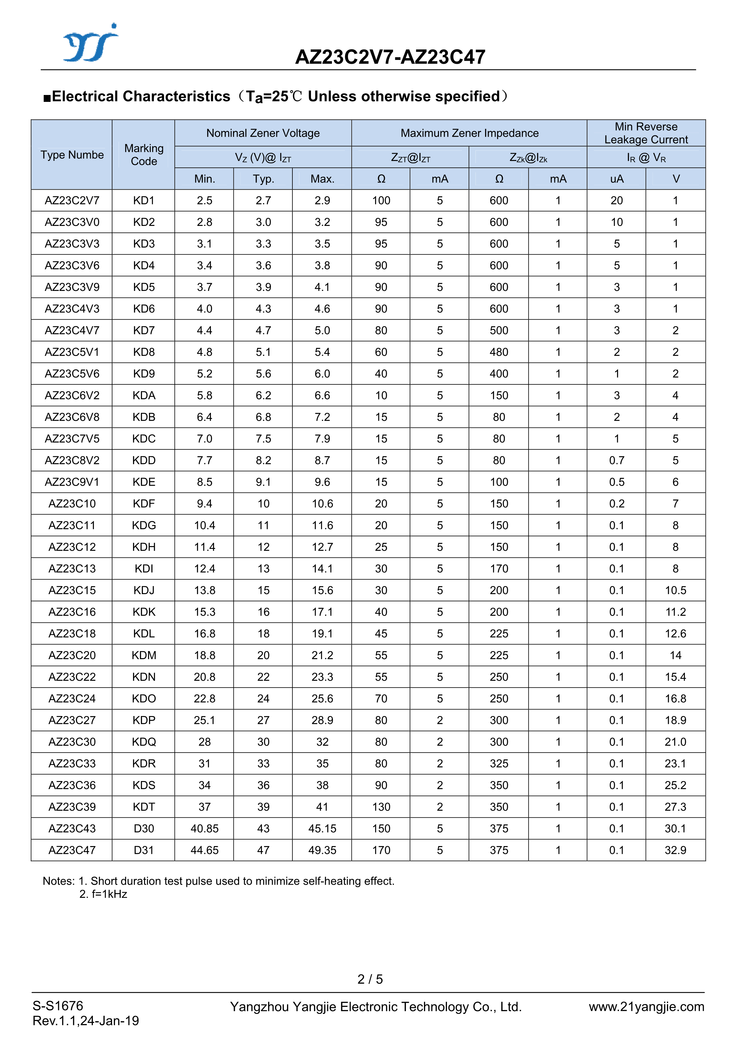 AZ23C4V7数据手册SOT-23封装YANGJIE(扬杰)PDF规格书,中英文下载