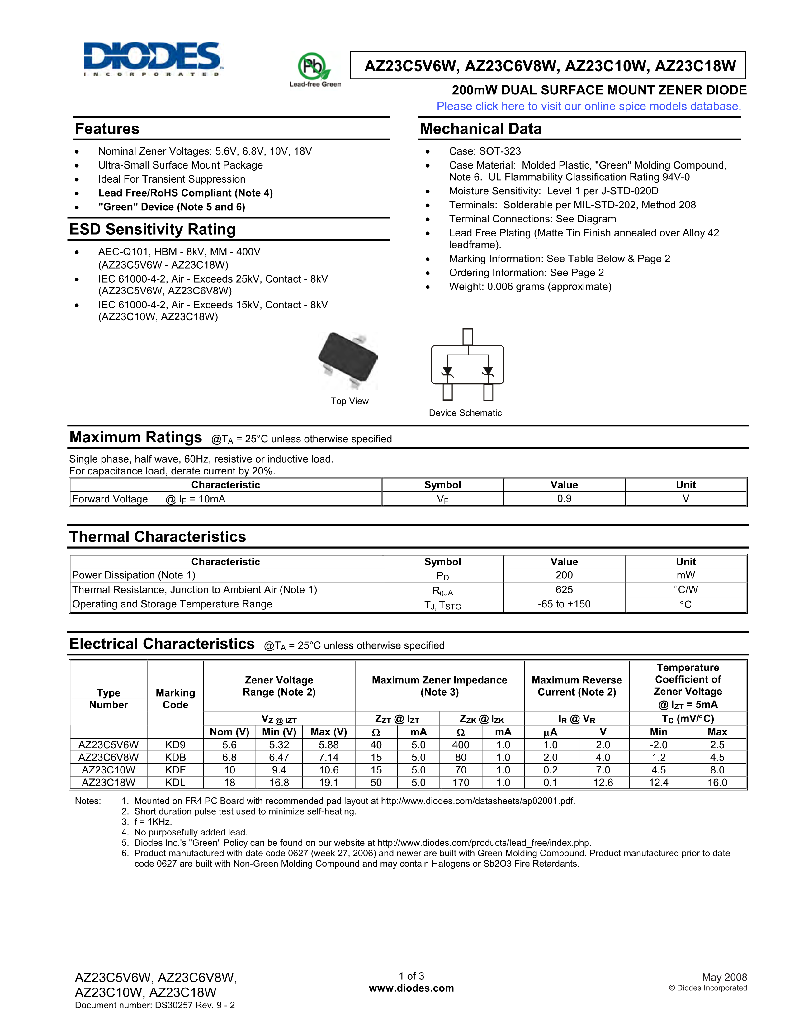 AZ23C5V6W-7-F数据手册SOT-323封装DIODES(美台)PDF规格书,中英文下载
