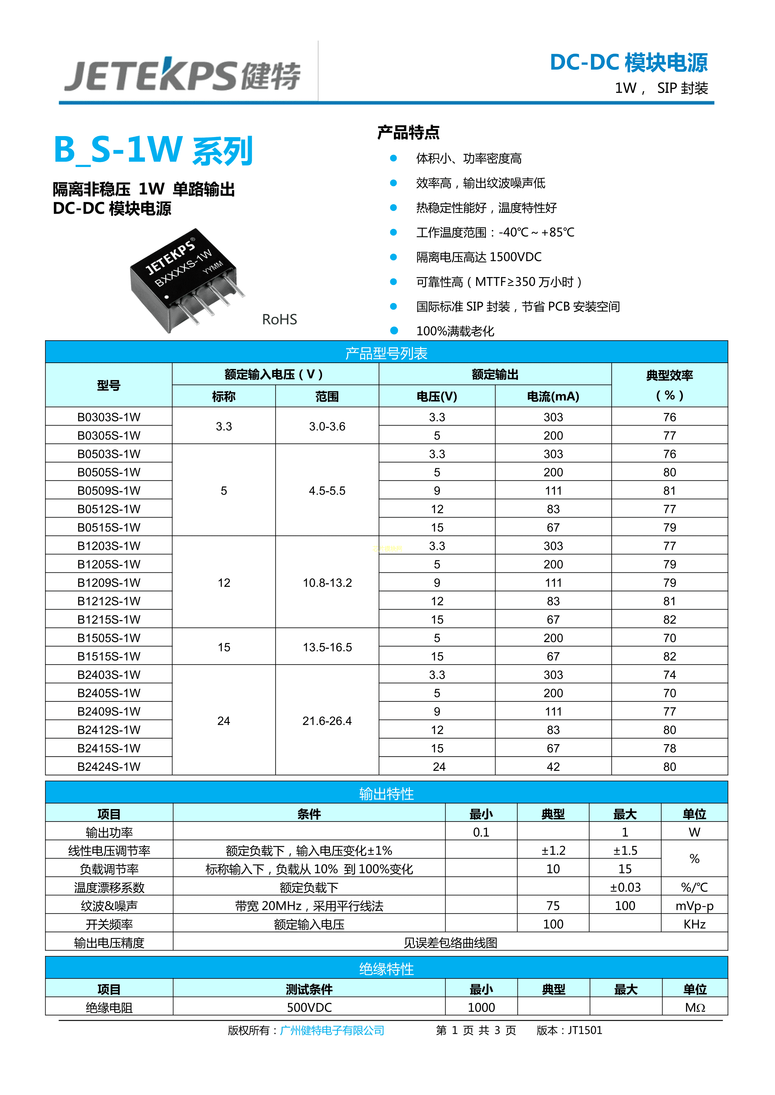 B0303S-1W数据手册插件封装JETEKPS(健特)PDF规格书,中英文下载