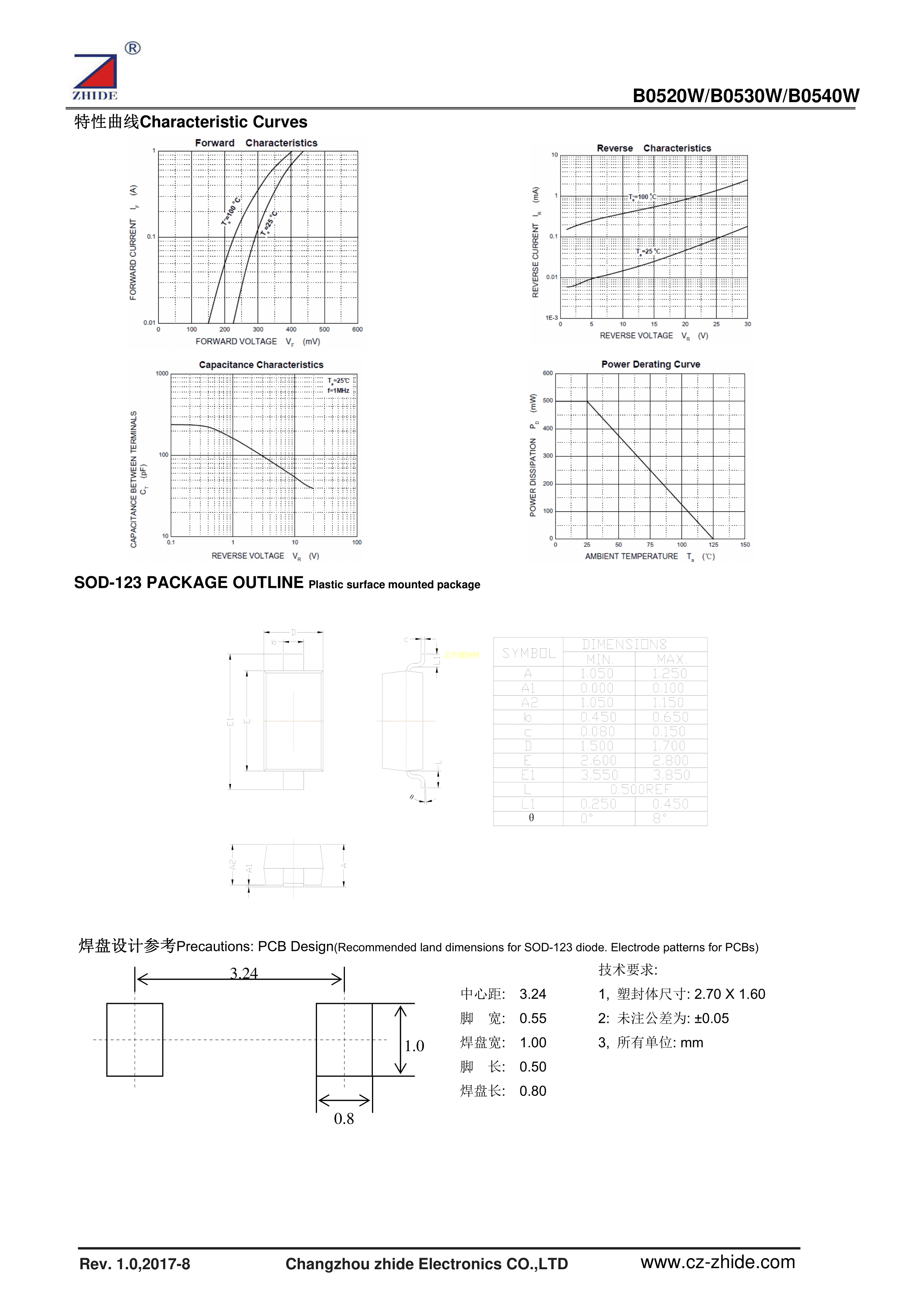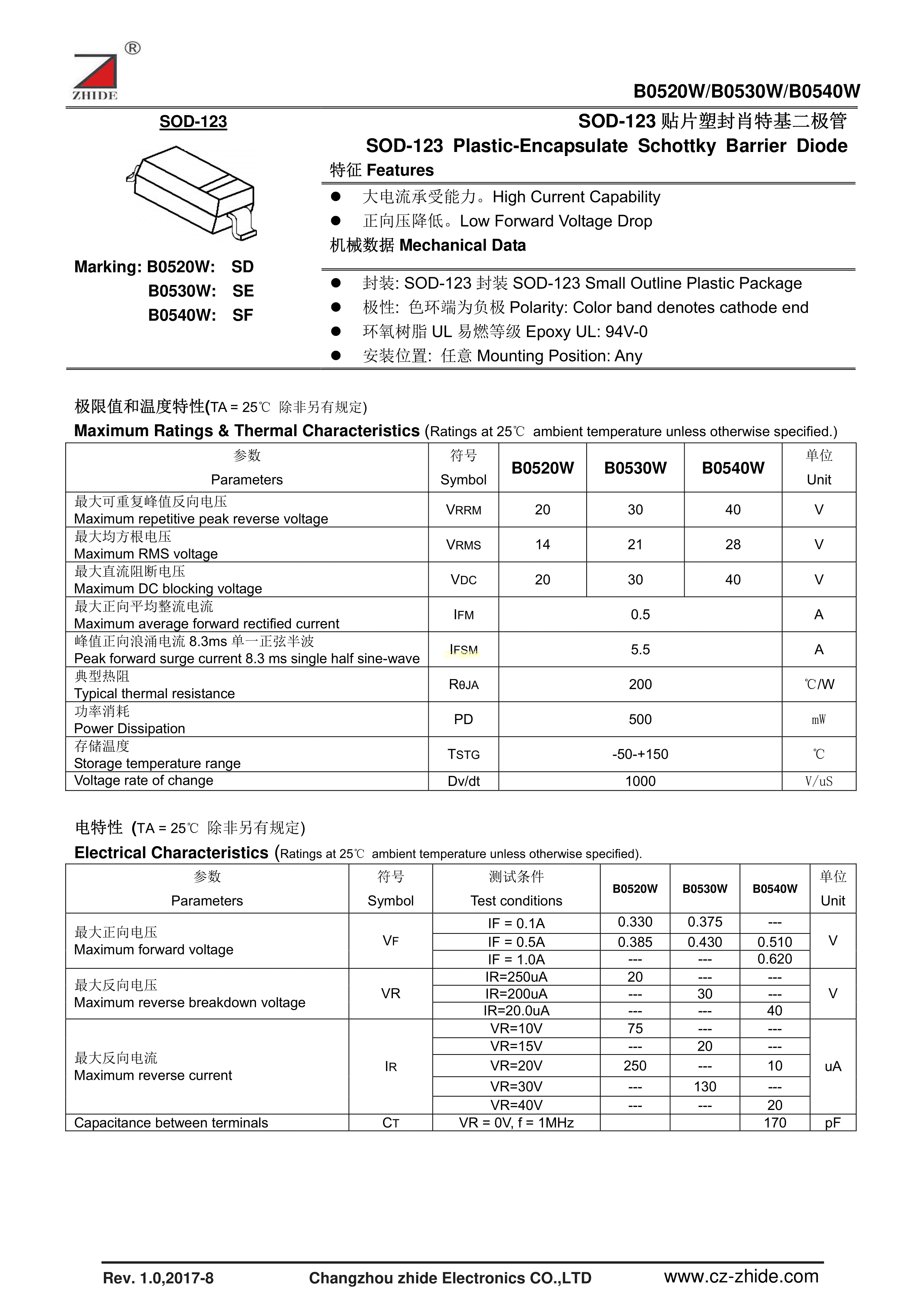 B0520W数据手册SOD-123封装ZHIDE(志得)PDF规格书,中英文下载
