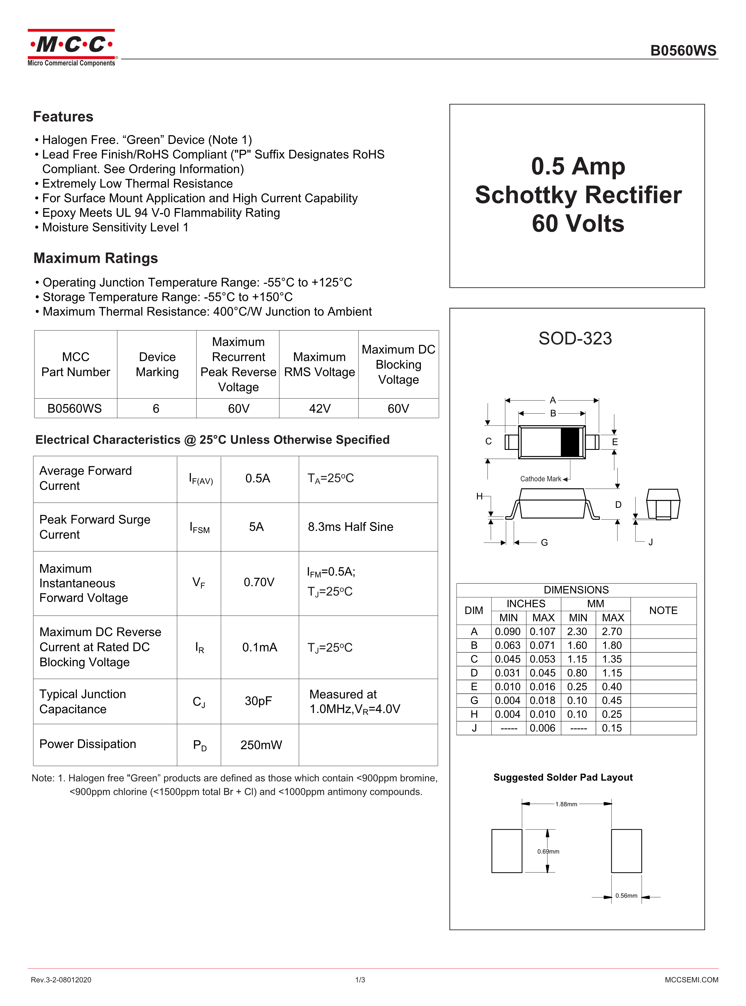 B0560WS-TP数据手册SOD-323封装MCC(美微科)PDF规格书,中英文下载