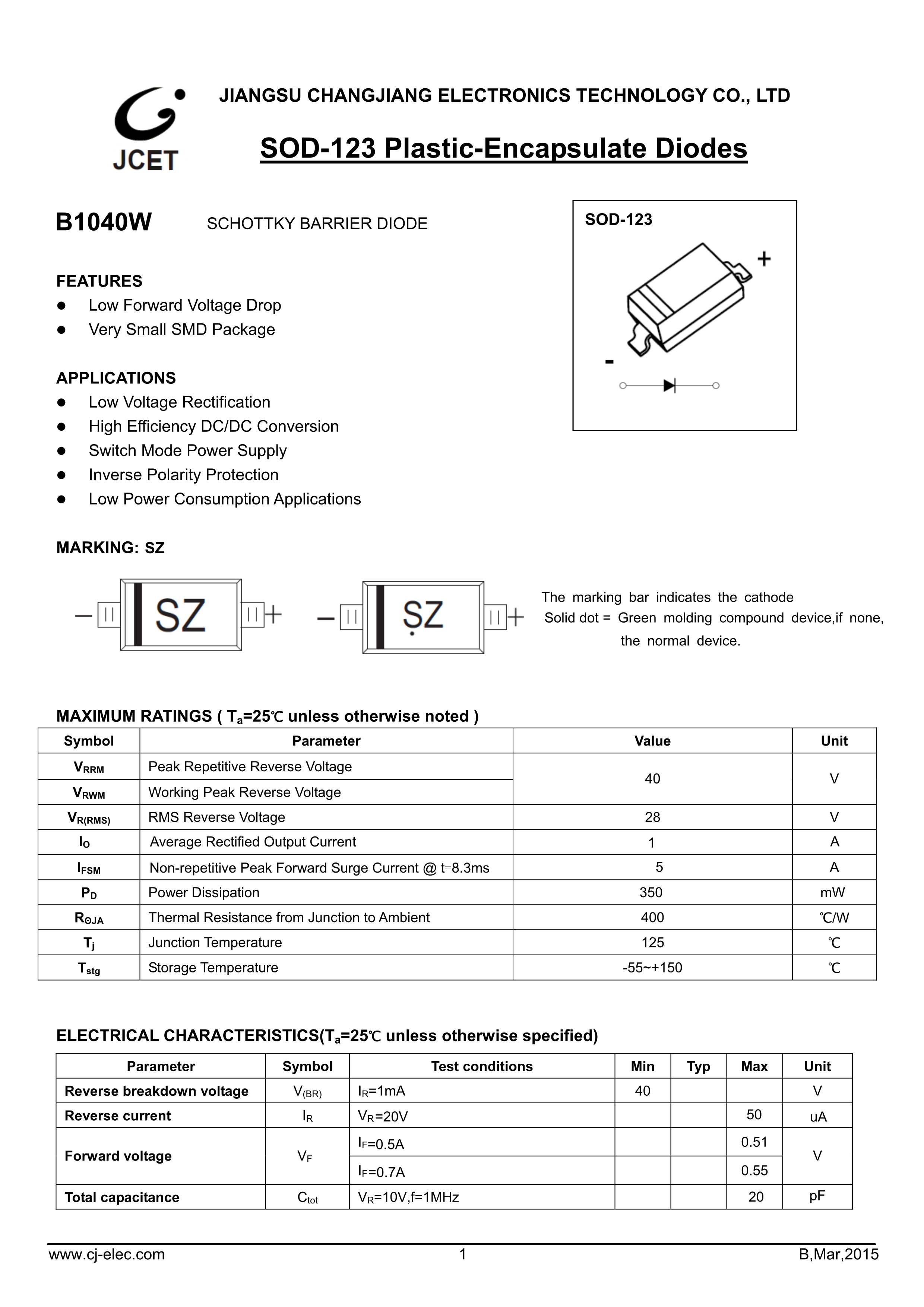 B1040W数据手册SOD-123封装CJ(江苏长电-长晶)PDF规格书,中英文下载