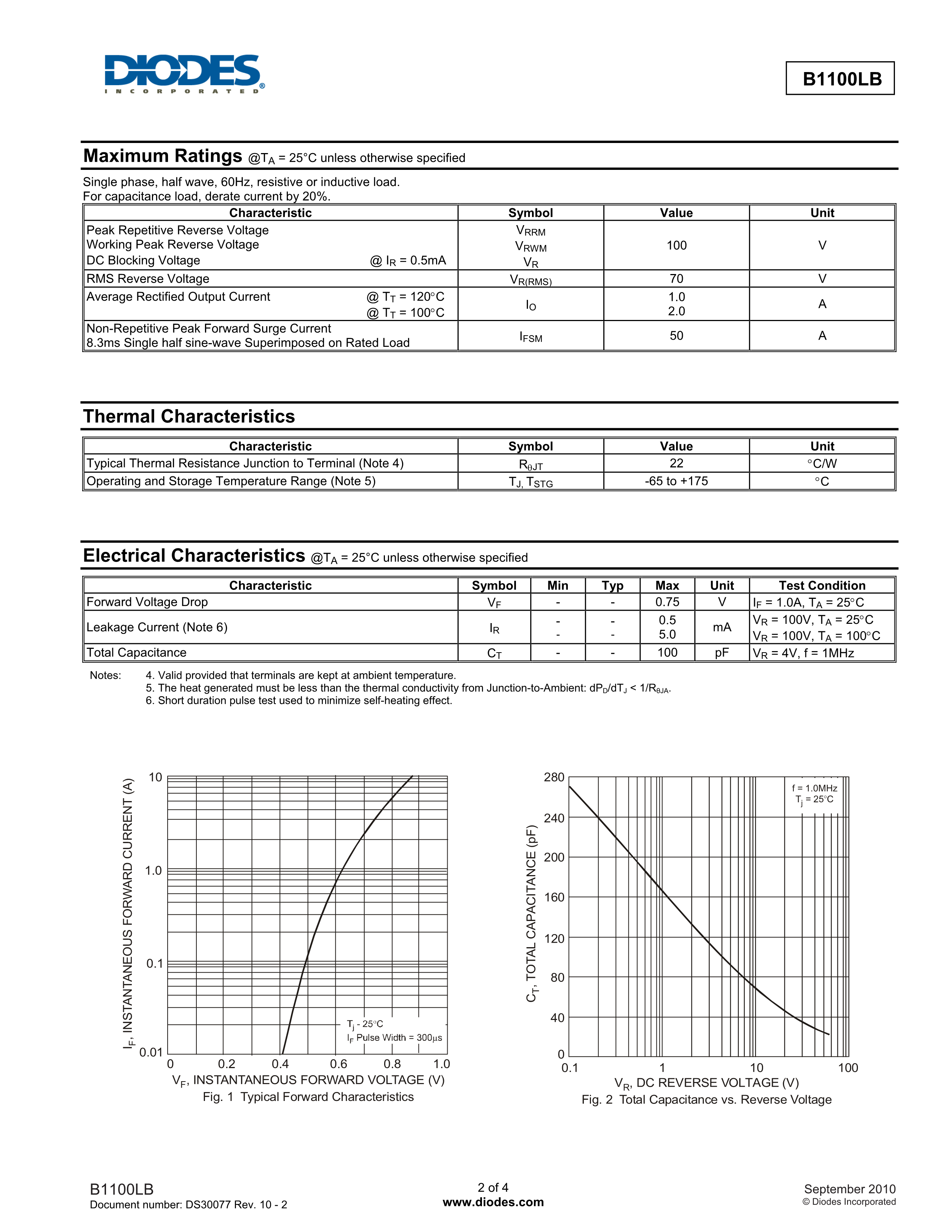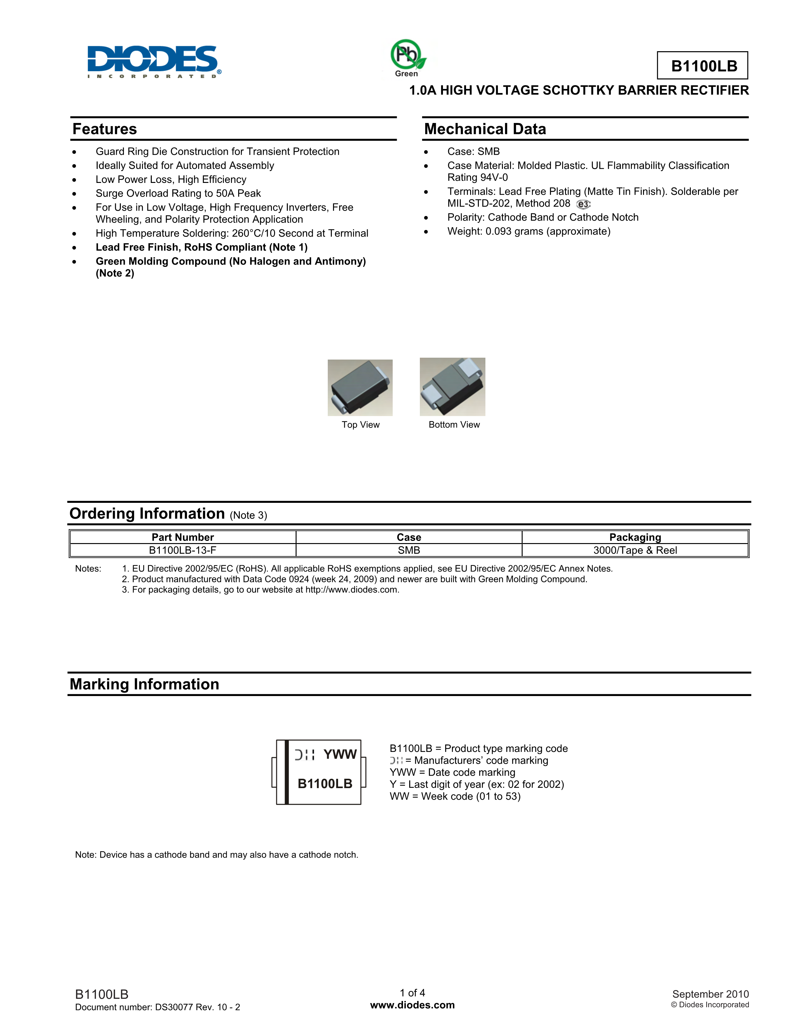B1100LB-13-F数据手册SMB(DO-214AA)封装DIODES(美台)PDF规格书,中英