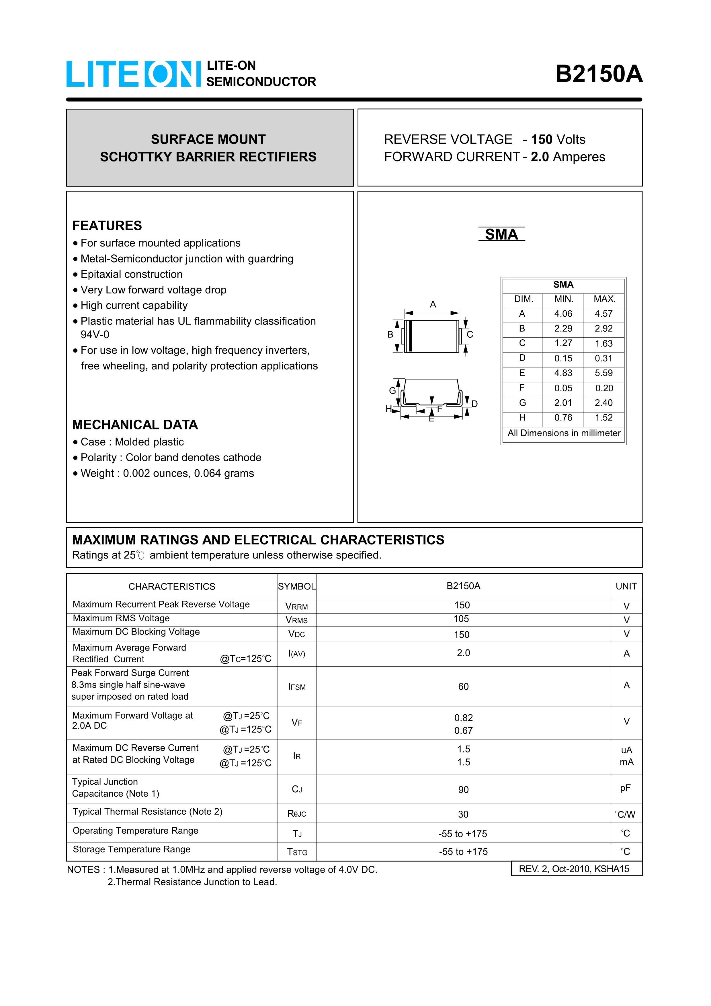 B2150A数据手册SMA封装LITEON(台湾敦南)PDF规格书,中英文下载