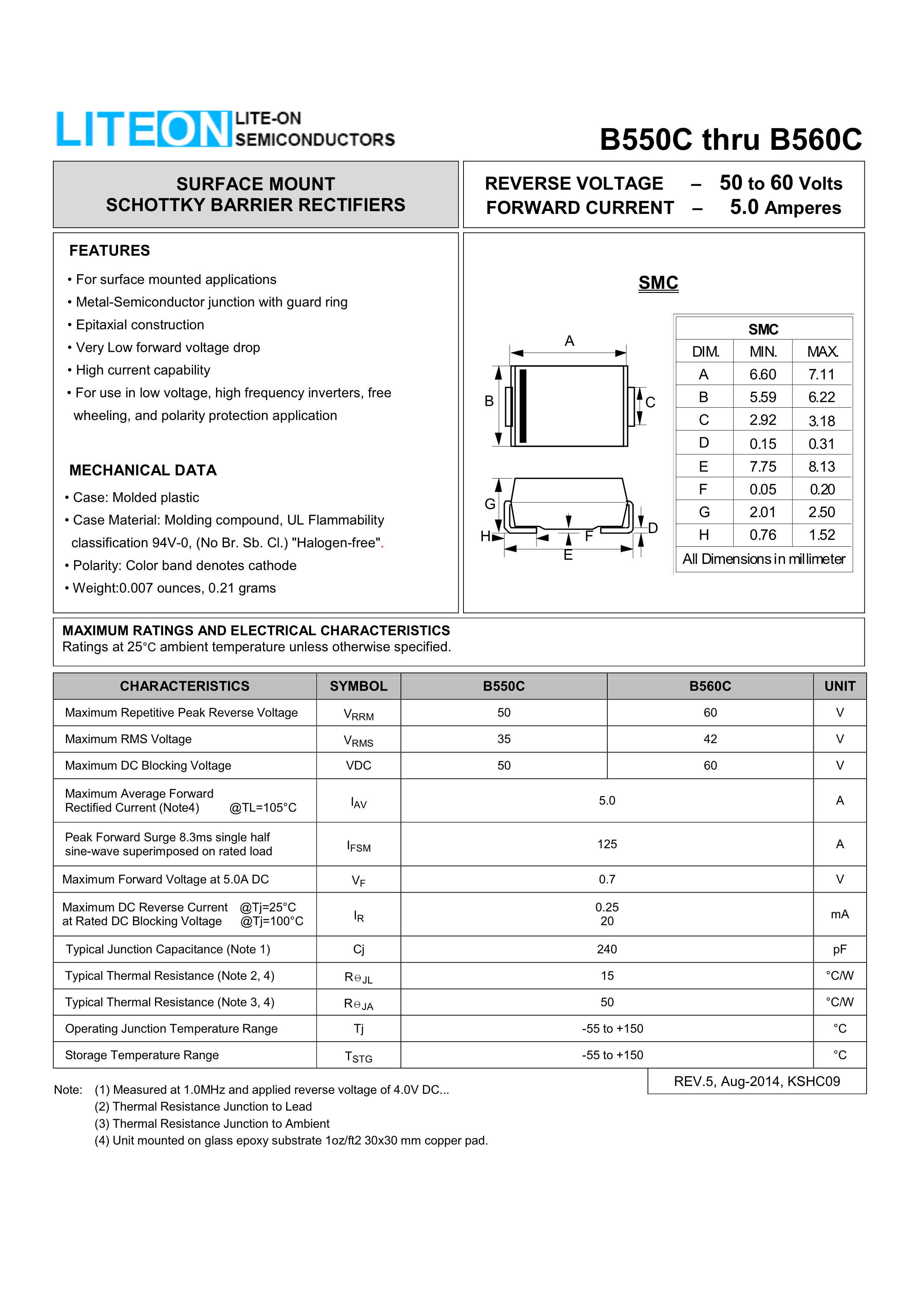 B560C数据手册SMC(DO-214AB)封装LITEON(台湾敦南)PDF规格书,中英文下载