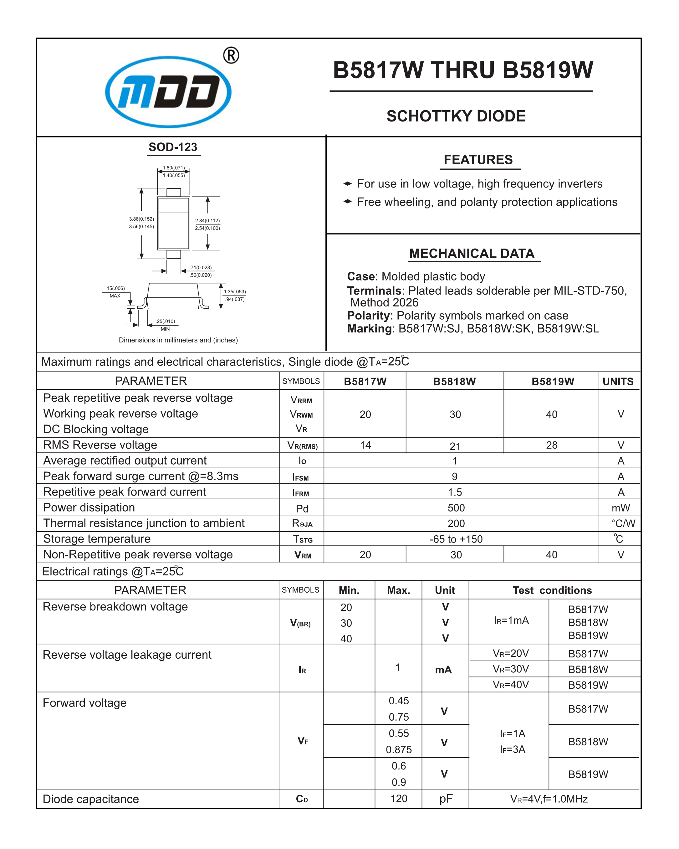 B5817W-SJ数据手册SOD-123封装MDDPDF规格书,中英文下载
