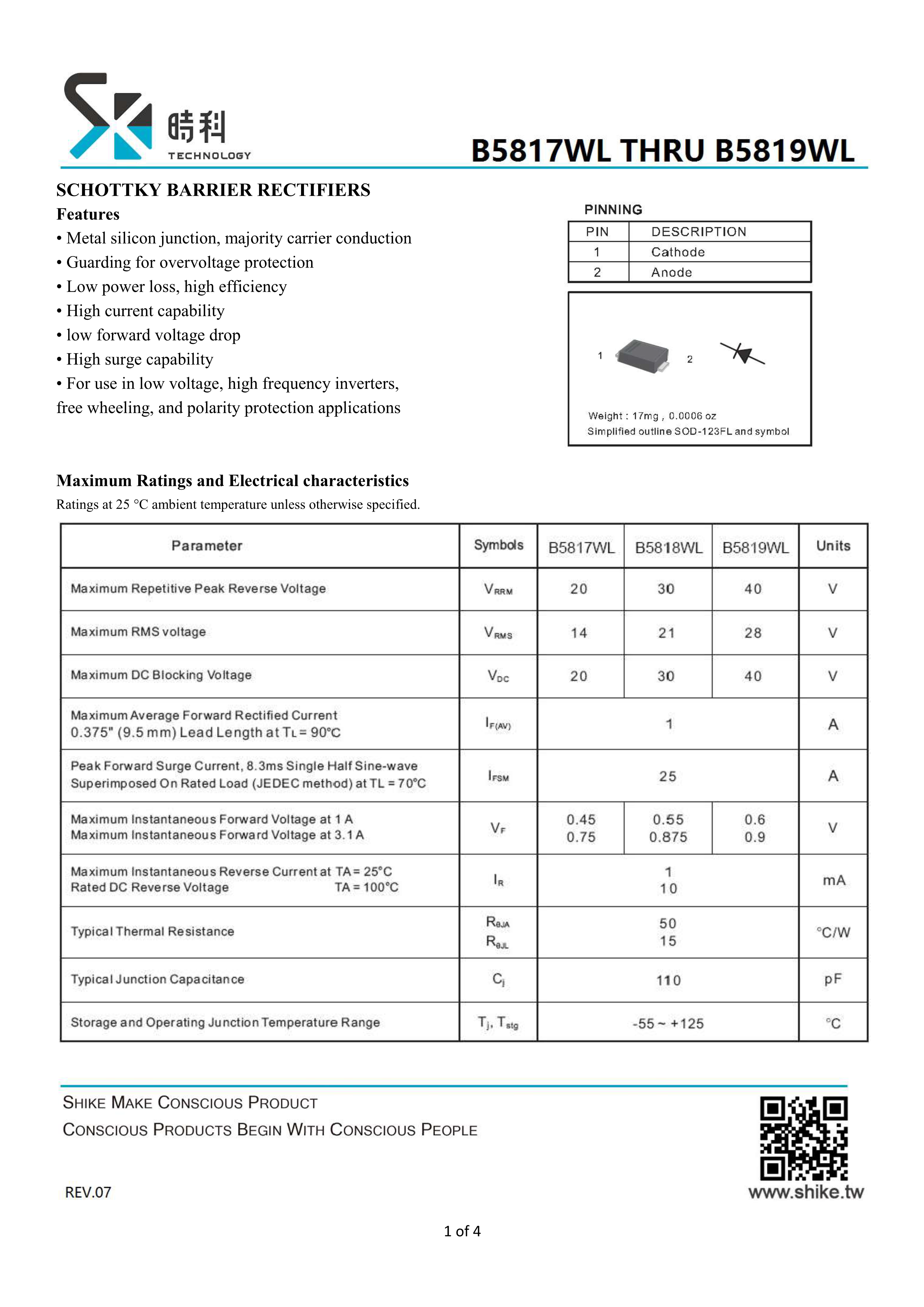 B5817WL数据手册SOD-123F封装SHIKUES(时科)PDF规格书,中英文下载