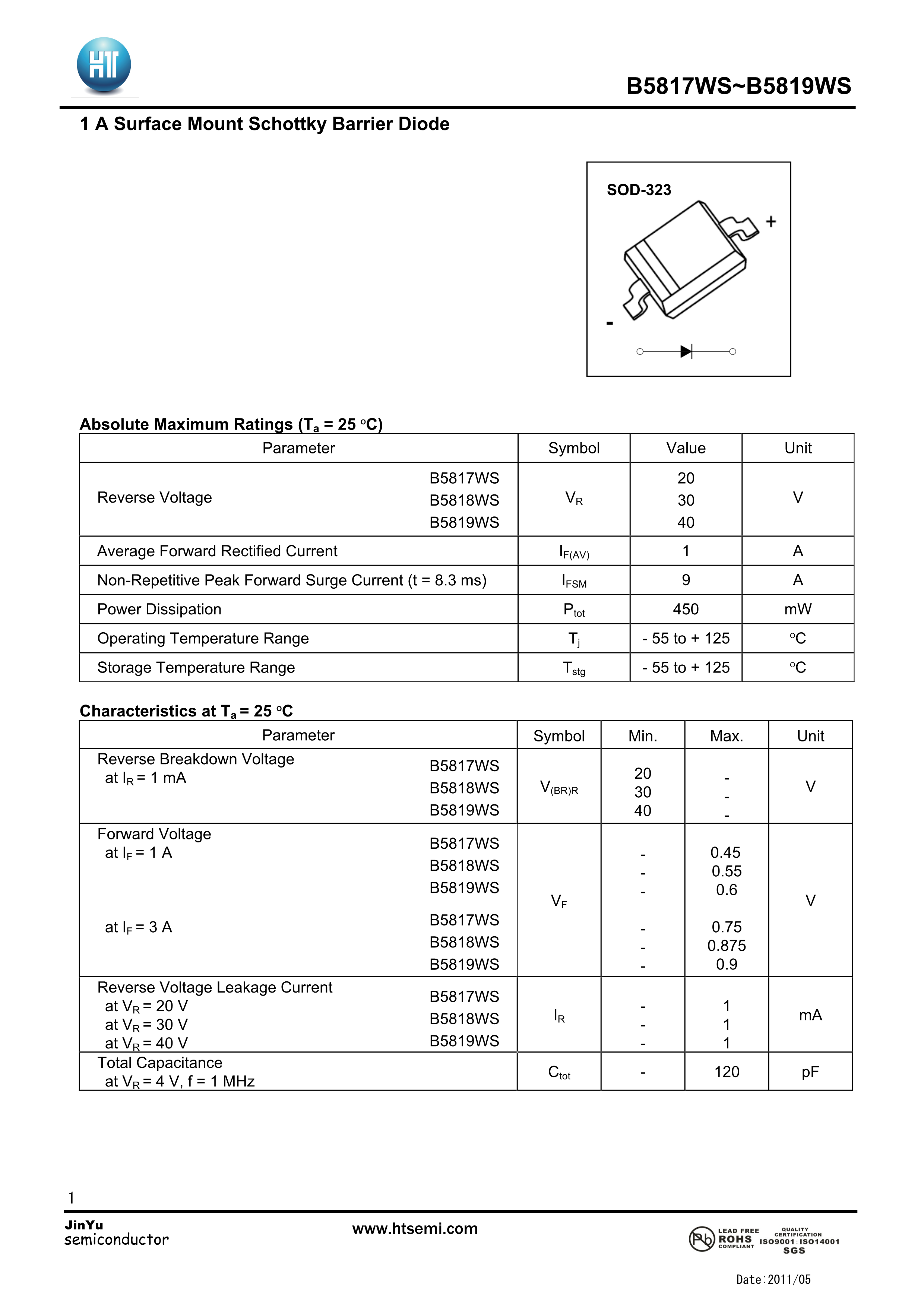B5817WS数据手册SOD-323封装HT(金誉)PDF规格书,中英文下载