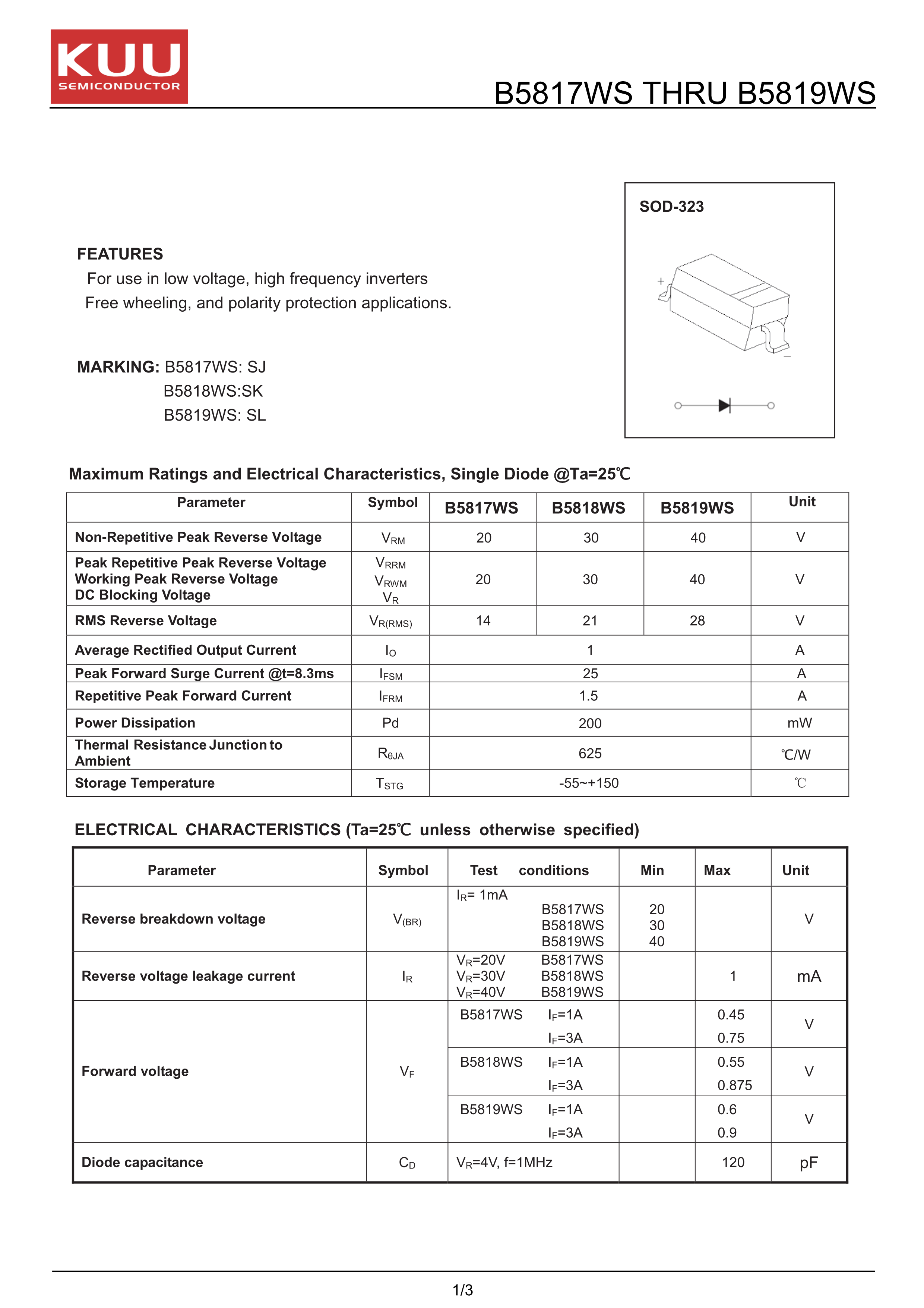 B5817WS数据手册SOD-323封装KUUPDF规格书,中英文下载