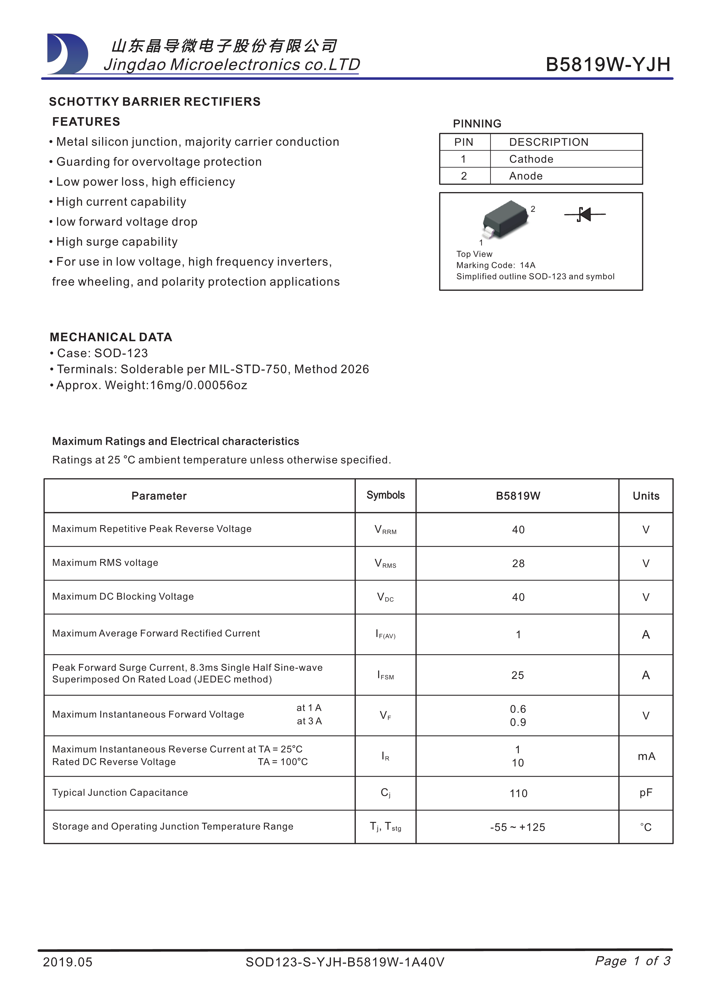 B5819W数据手册SOD-123封装晶导微电子PDF规格书,中英文下载