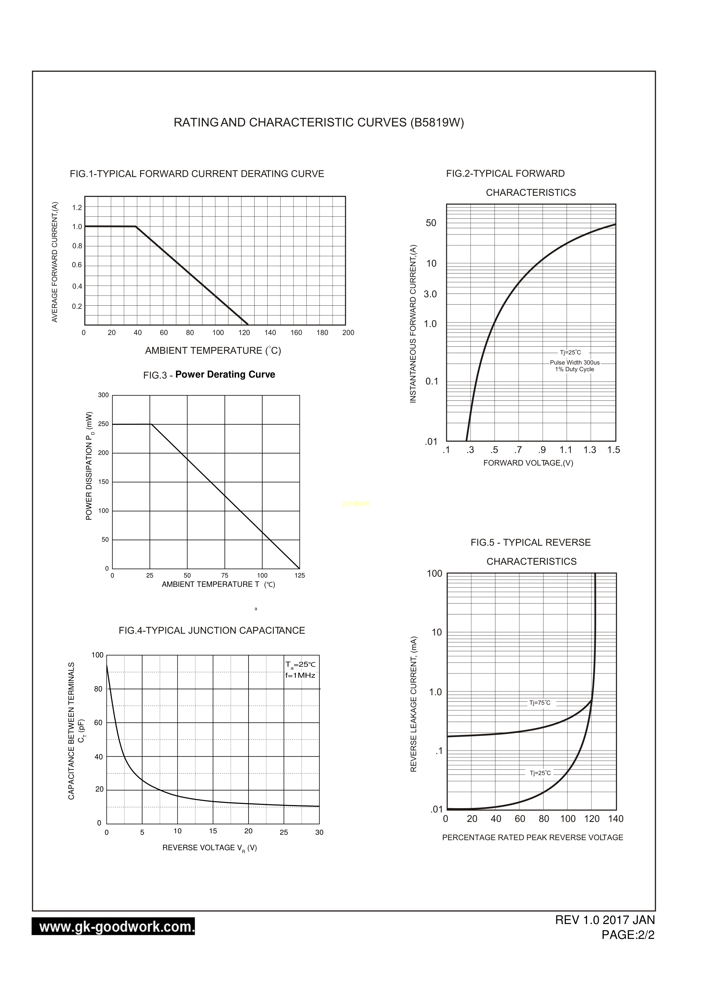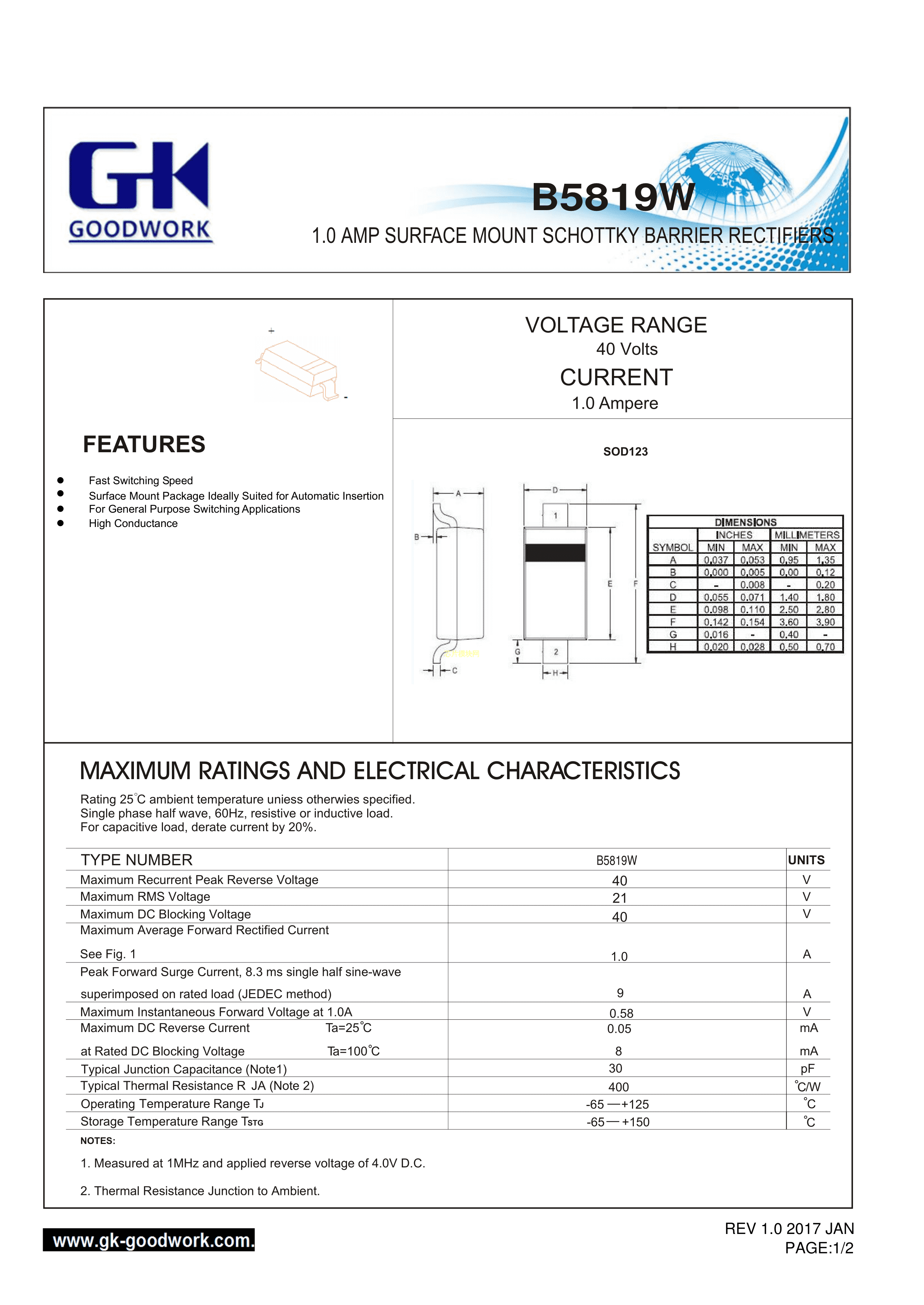 B5819W数据手册SOD-123封装GOODWORK(固得沃克)PDF规格书,中英文下载