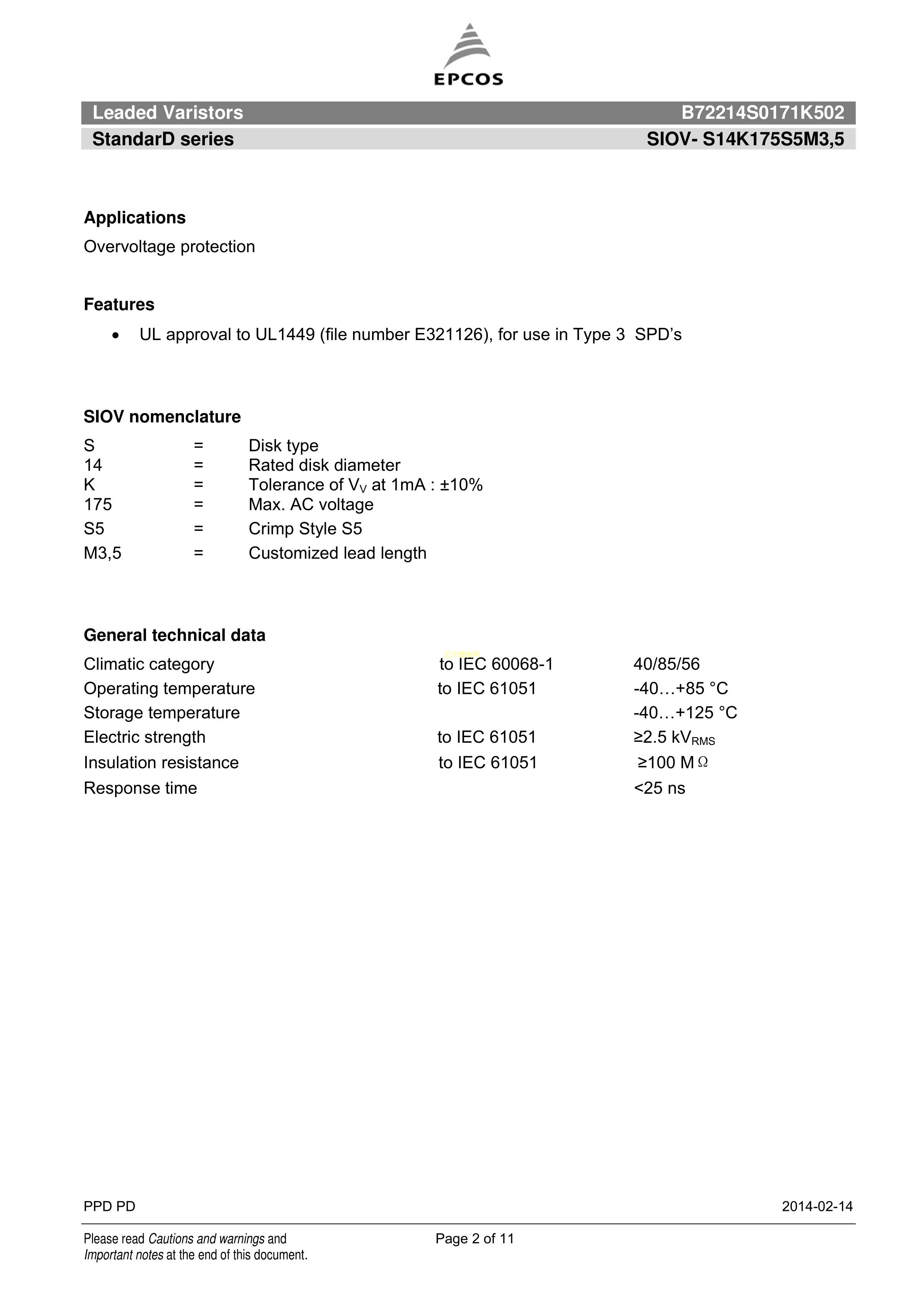 B72214S0171K502数据手册径向引线P7.5mm封装TDKPDF规格书,中英文下载