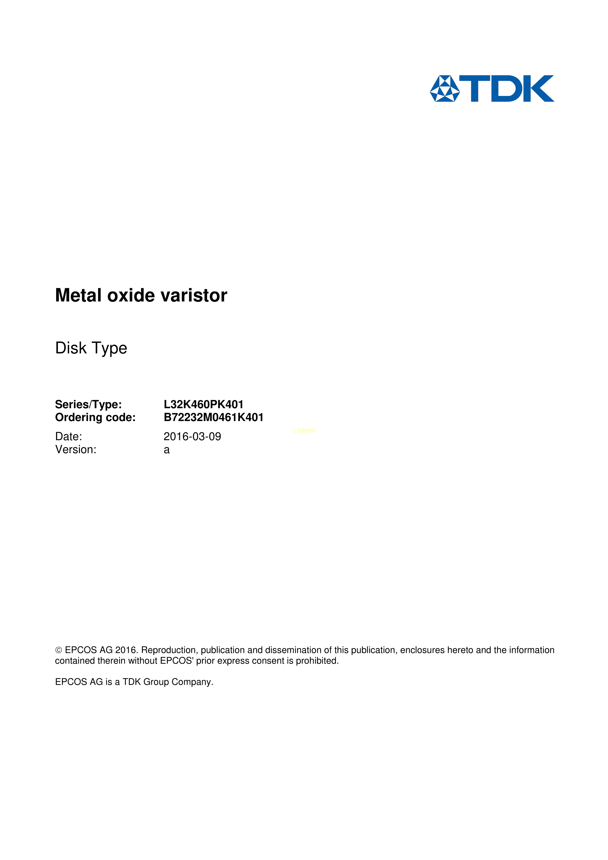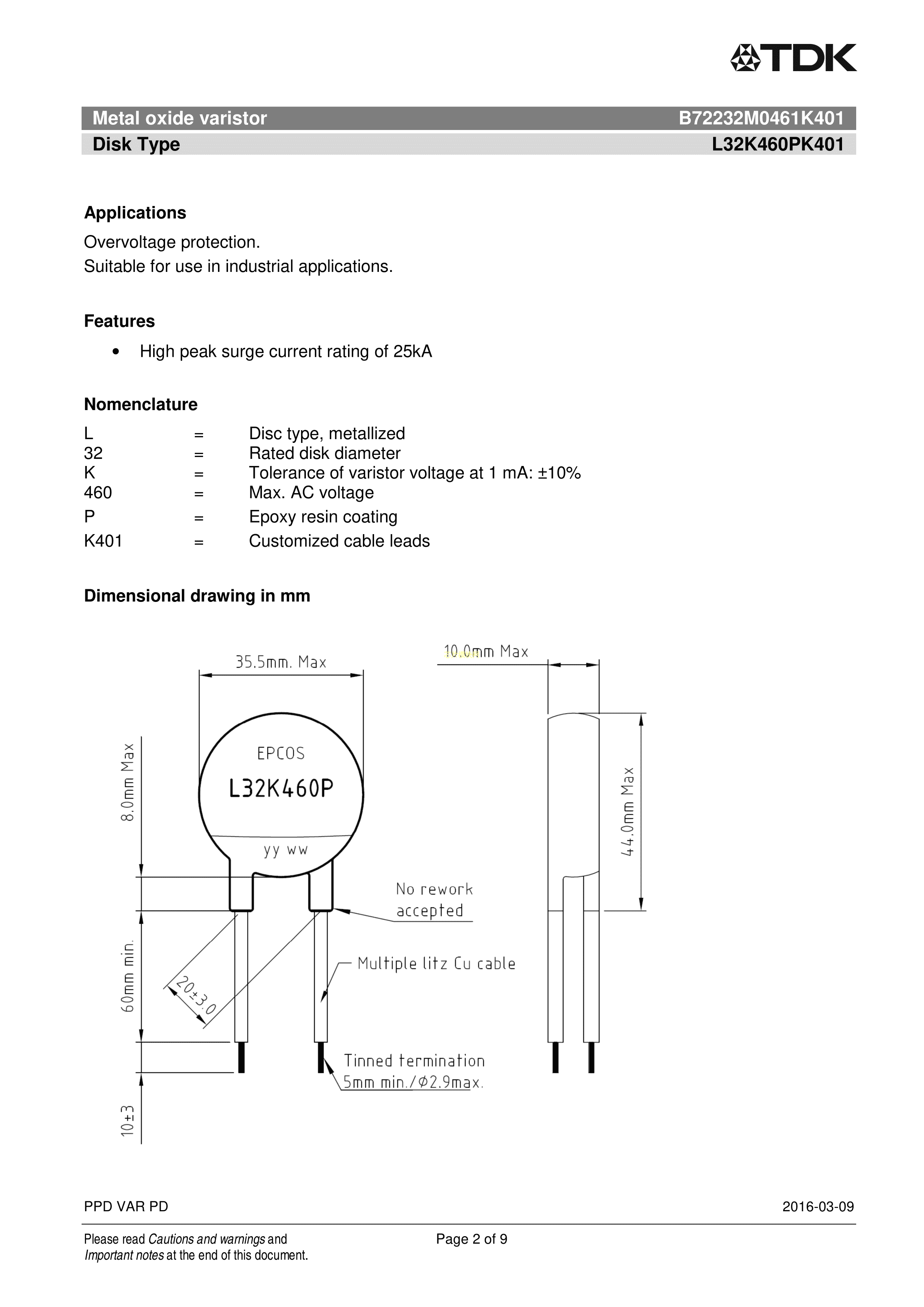 B72232M0461K401数据手册径向引线封装TDKPDF规格书,中英文下载