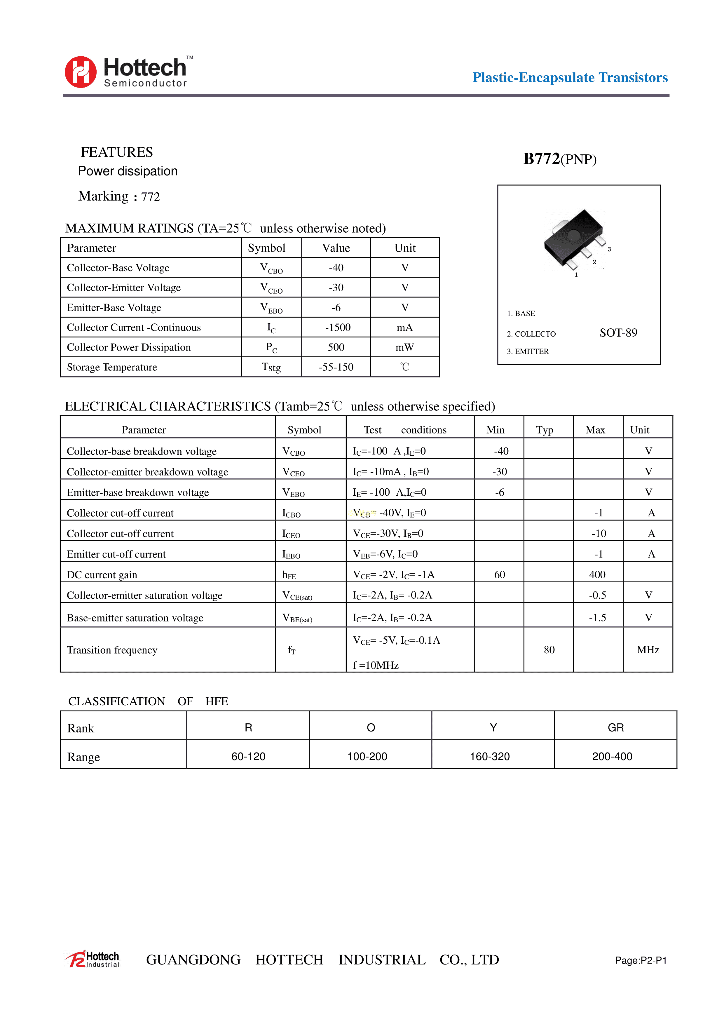 B772数据手册SOT-89(SOT-89-3)封装Hottech(合科泰)PDF规格书,中英文下载