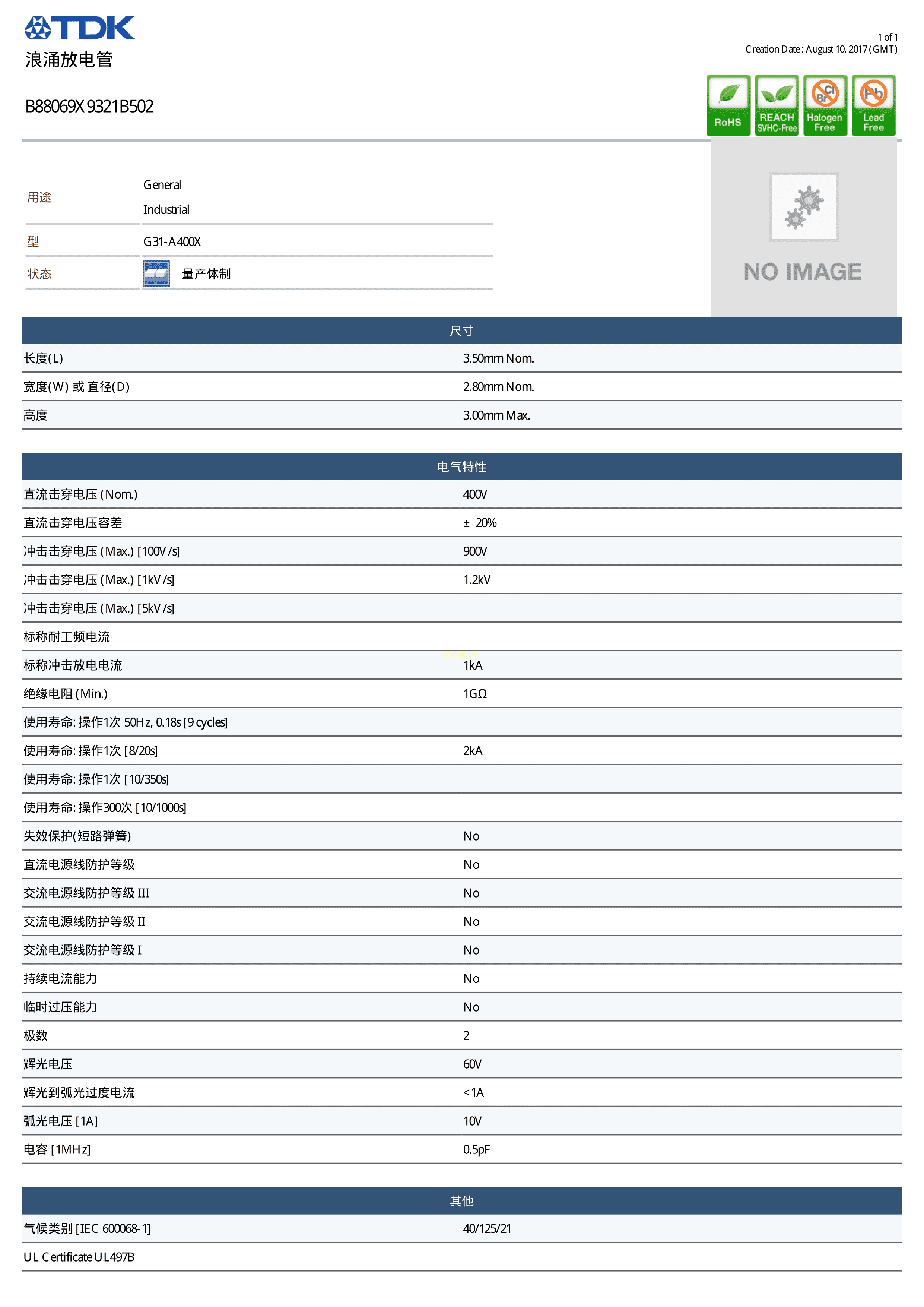 B88069X9321B502数据手册轴向引线封装TDKPDF规格书,中英文下载