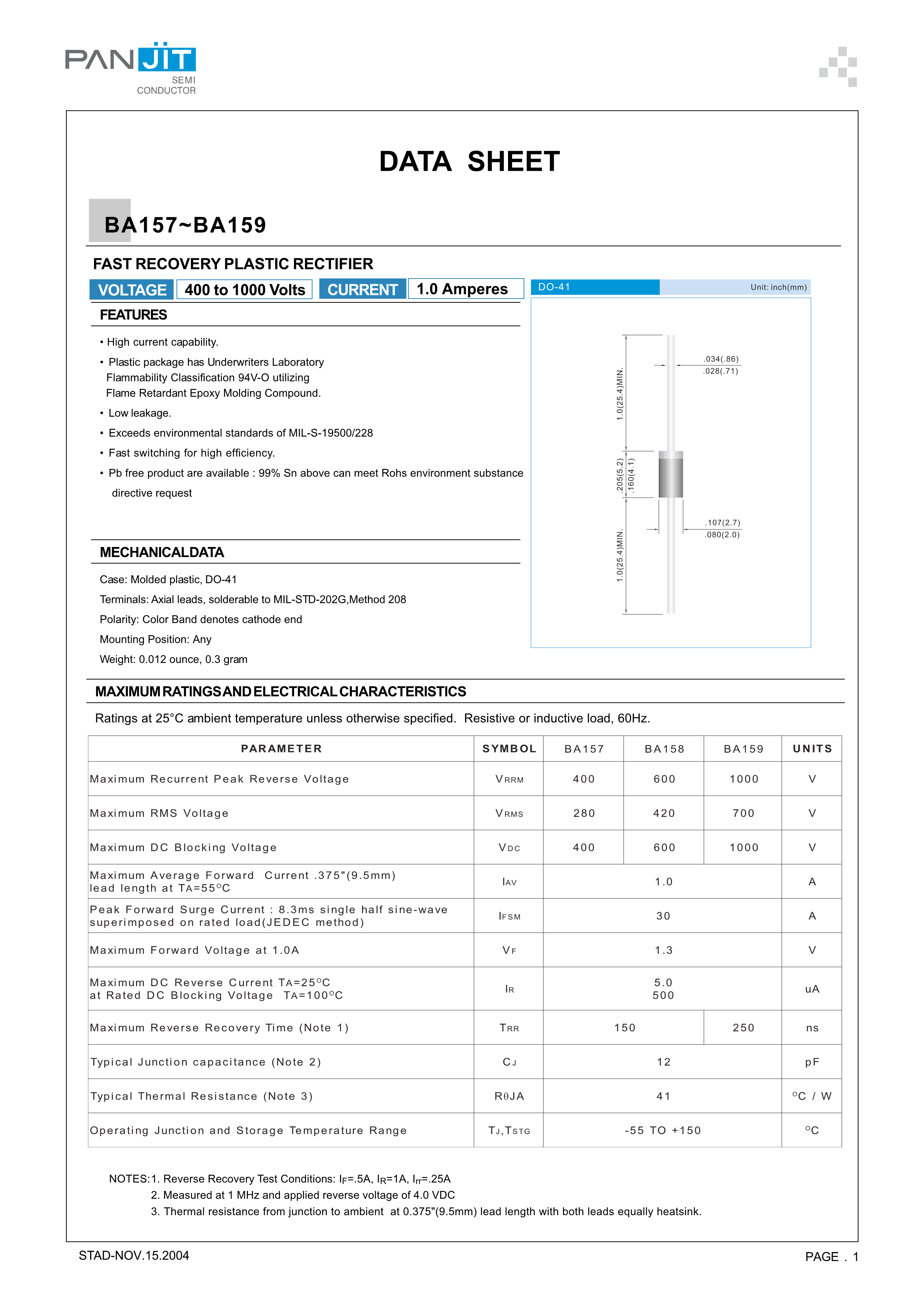 BA159数据手册DO-41封装PANJIT(强茂)PDF规格书,中英文下载