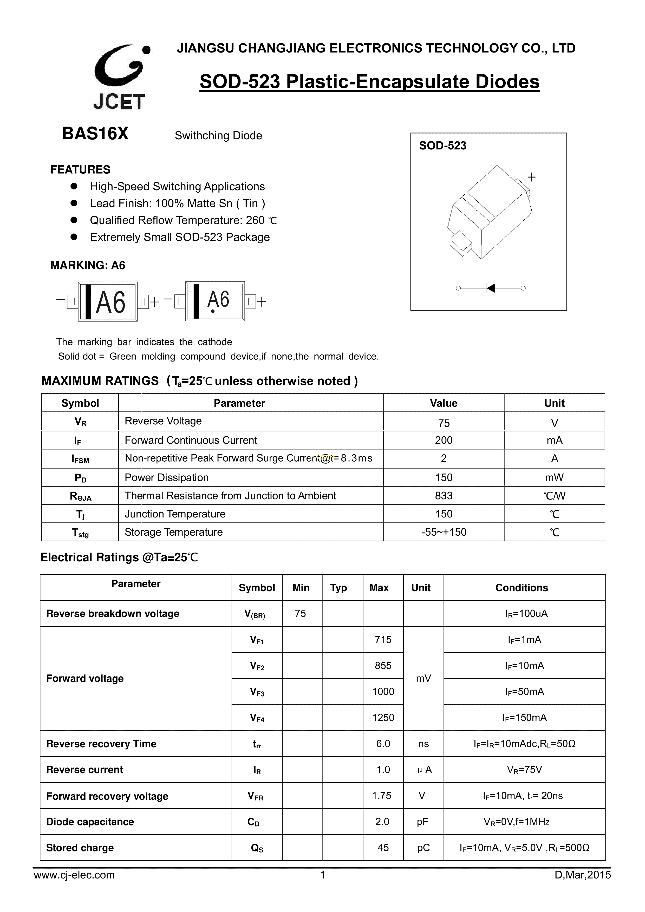 BAS16X数据手册SOD-523封装CJ(江苏长电-长晶)PDF规格书,中英文下载