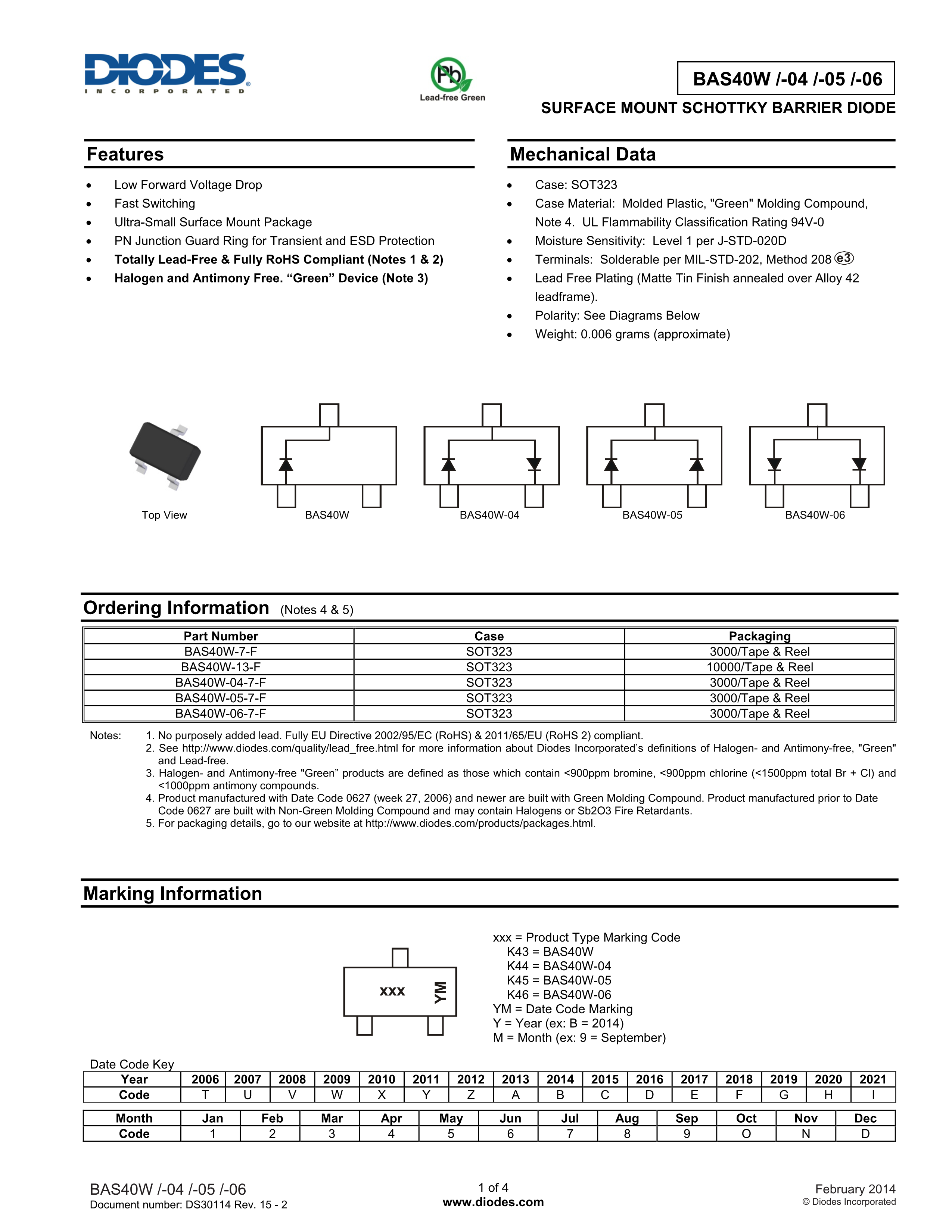 BAS40W-7-F数据手册SOT-323(SC-70)封装DIODES(美台)PDF规格书,中英文