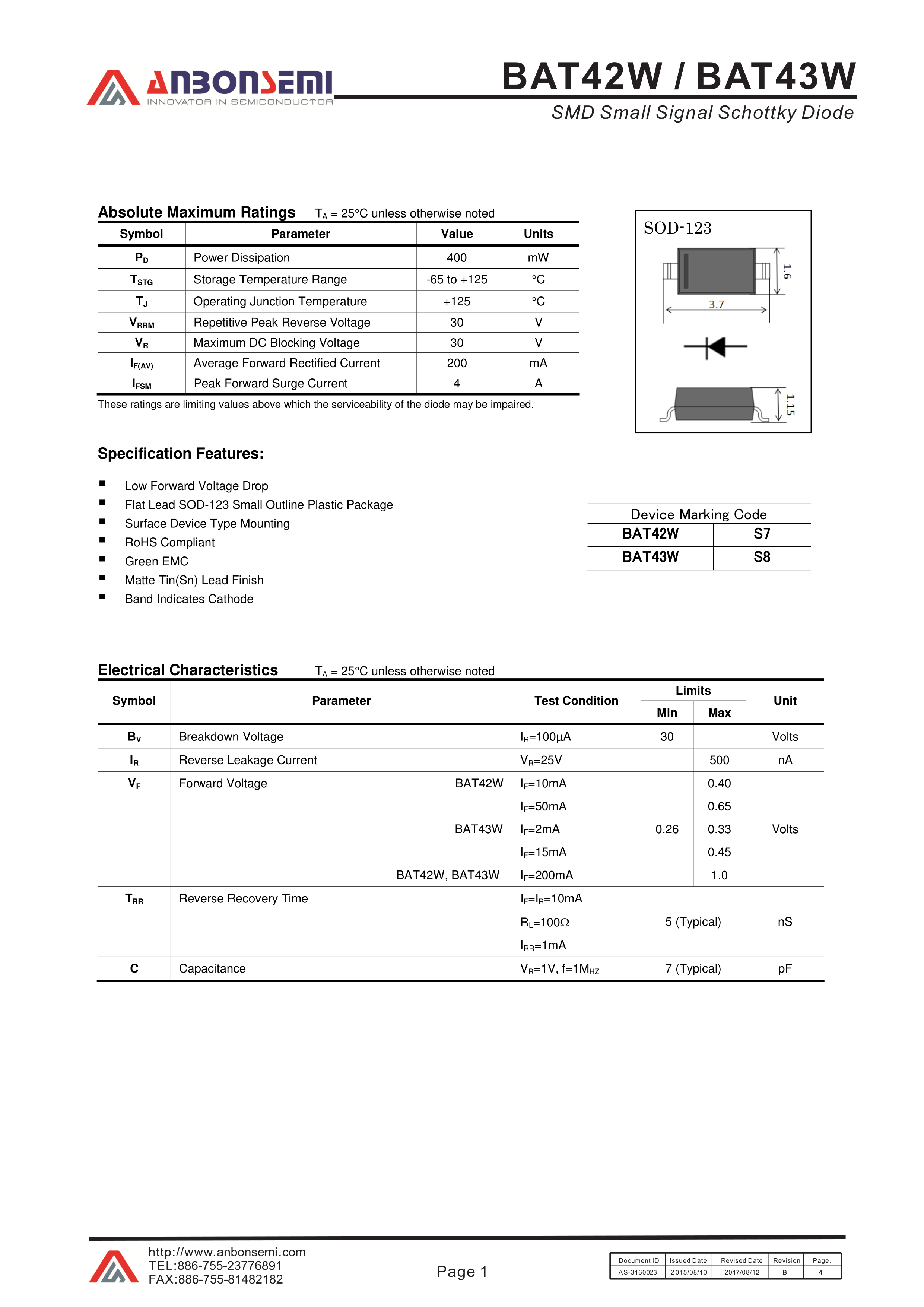 BAT42W数据手册SOD-123封装AnBon(台湾安邦)PDF规格书,中英文下载