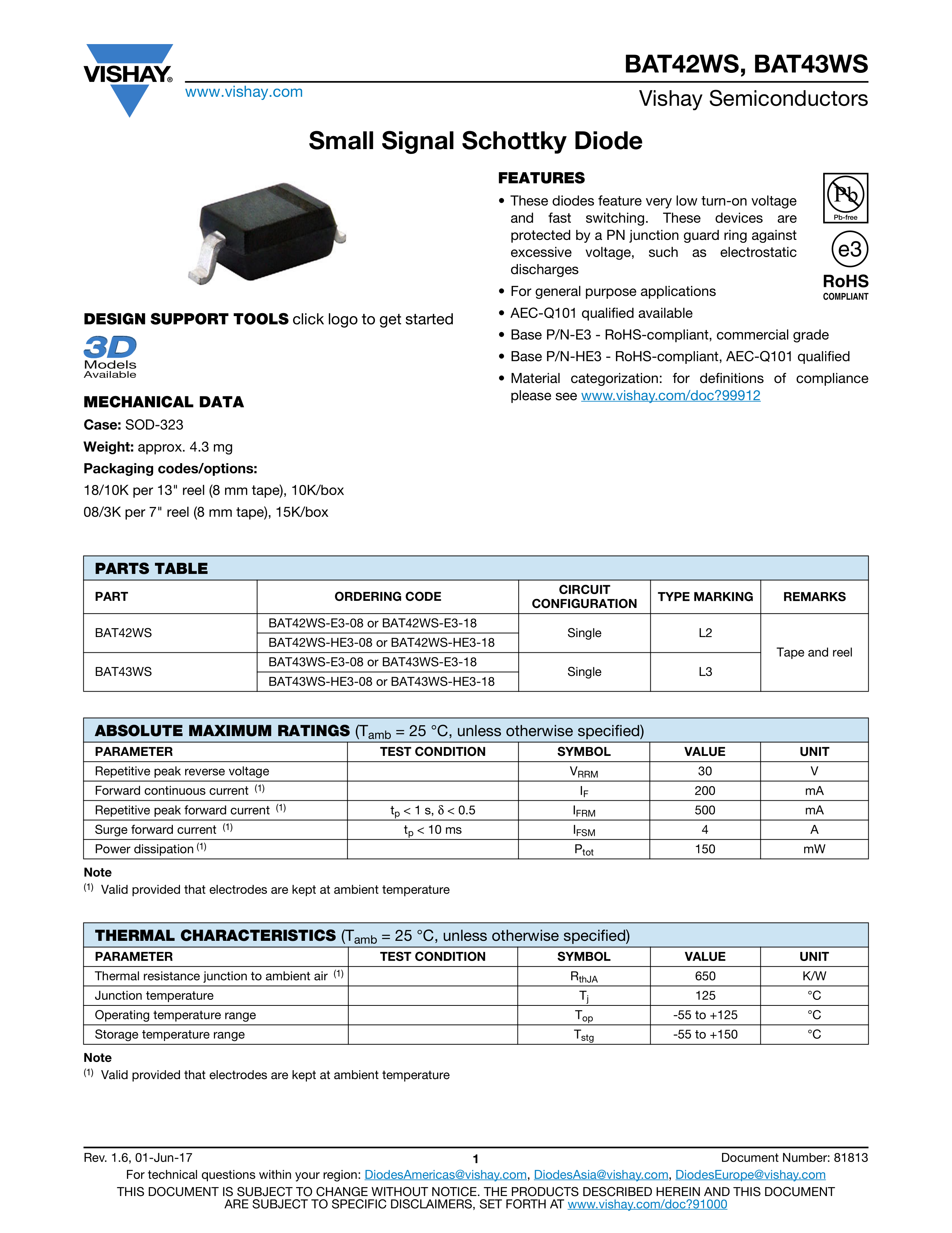 BAT42WS-E3-08数据手册SOD-323封装VISHAY(威世)PDF规格书,中英文下载
