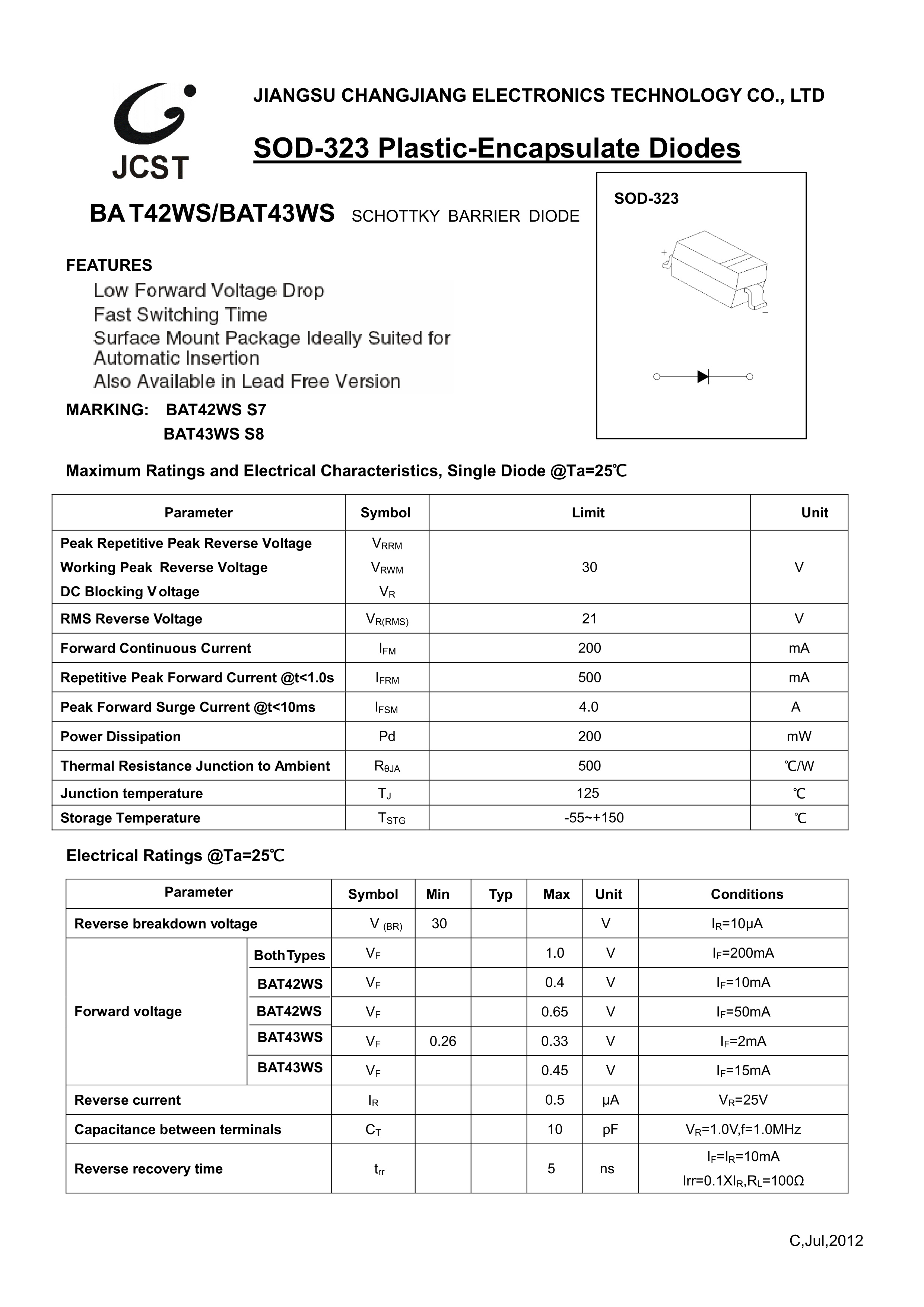 BAT43WS S8数据手册SOD-323封装CJ(江苏长电-长晶)PDF规格书,中英文下载