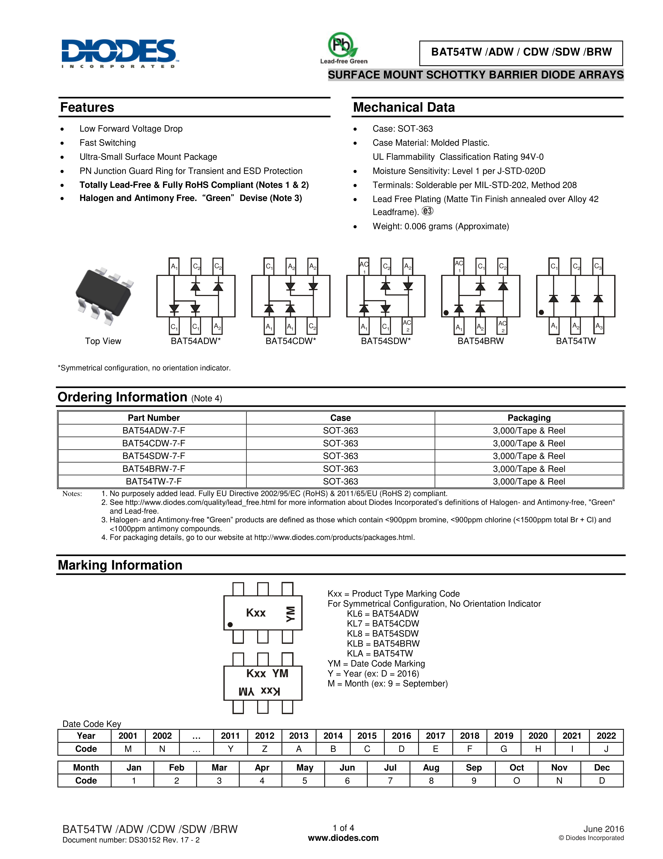 BAT54ADW-7-F数据手册SC-70-6(SOT-363)封装DIODES(美台)PDF规格书
