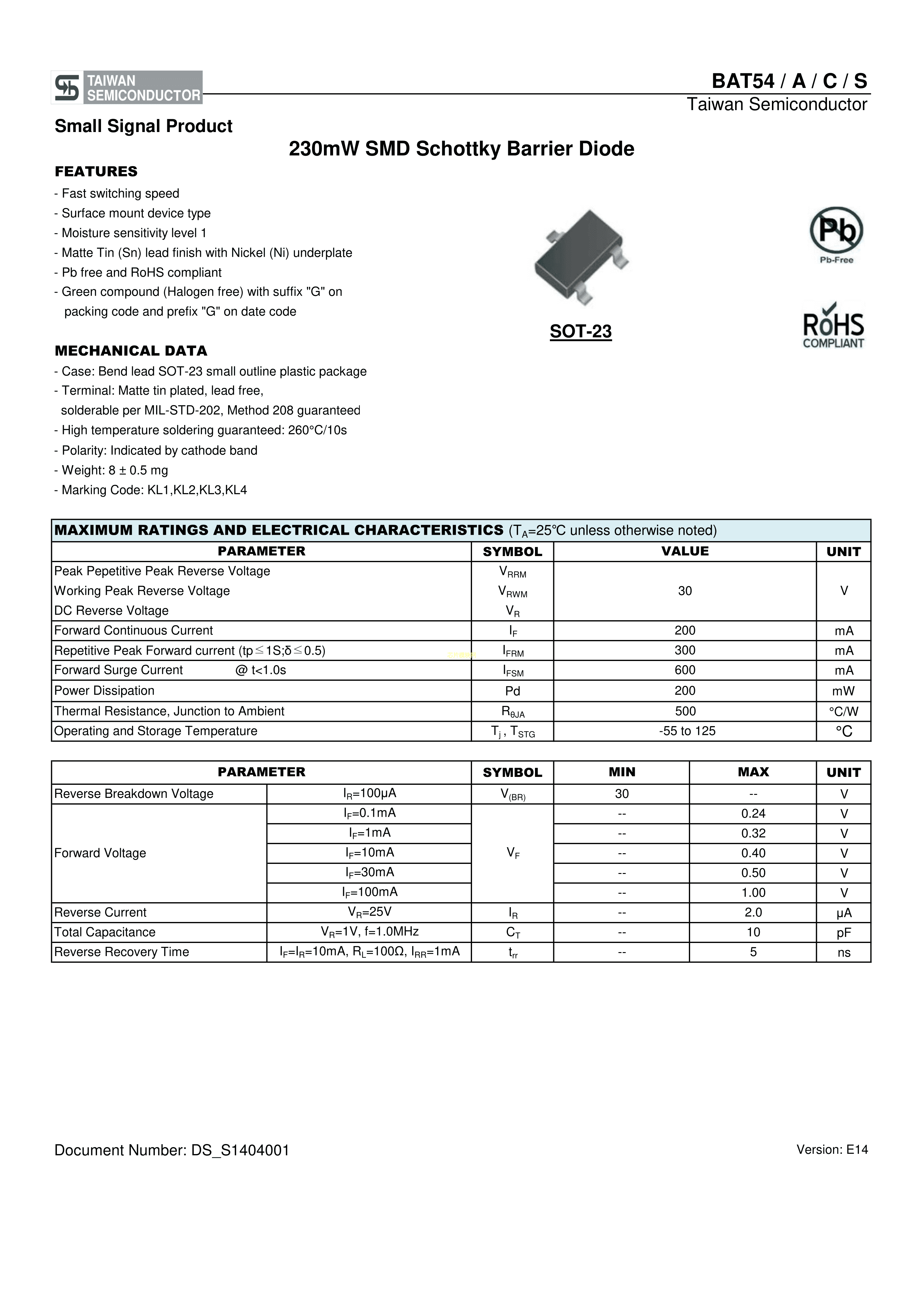 BAT54CRFG数据手册SOT-23封装TaiwanSemiconductor(台湾半导体)PDF规格书,中英文下载