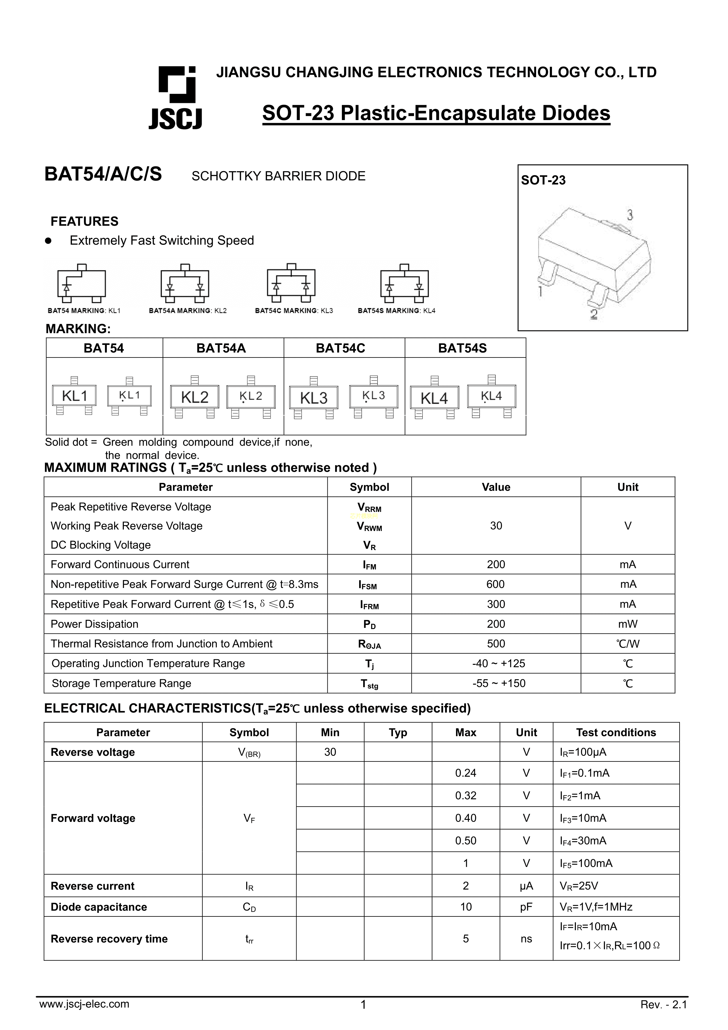 BAT54S数据手册SOT-23封装CJ(江苏长电-长晶)PDF规格书,中英文下载