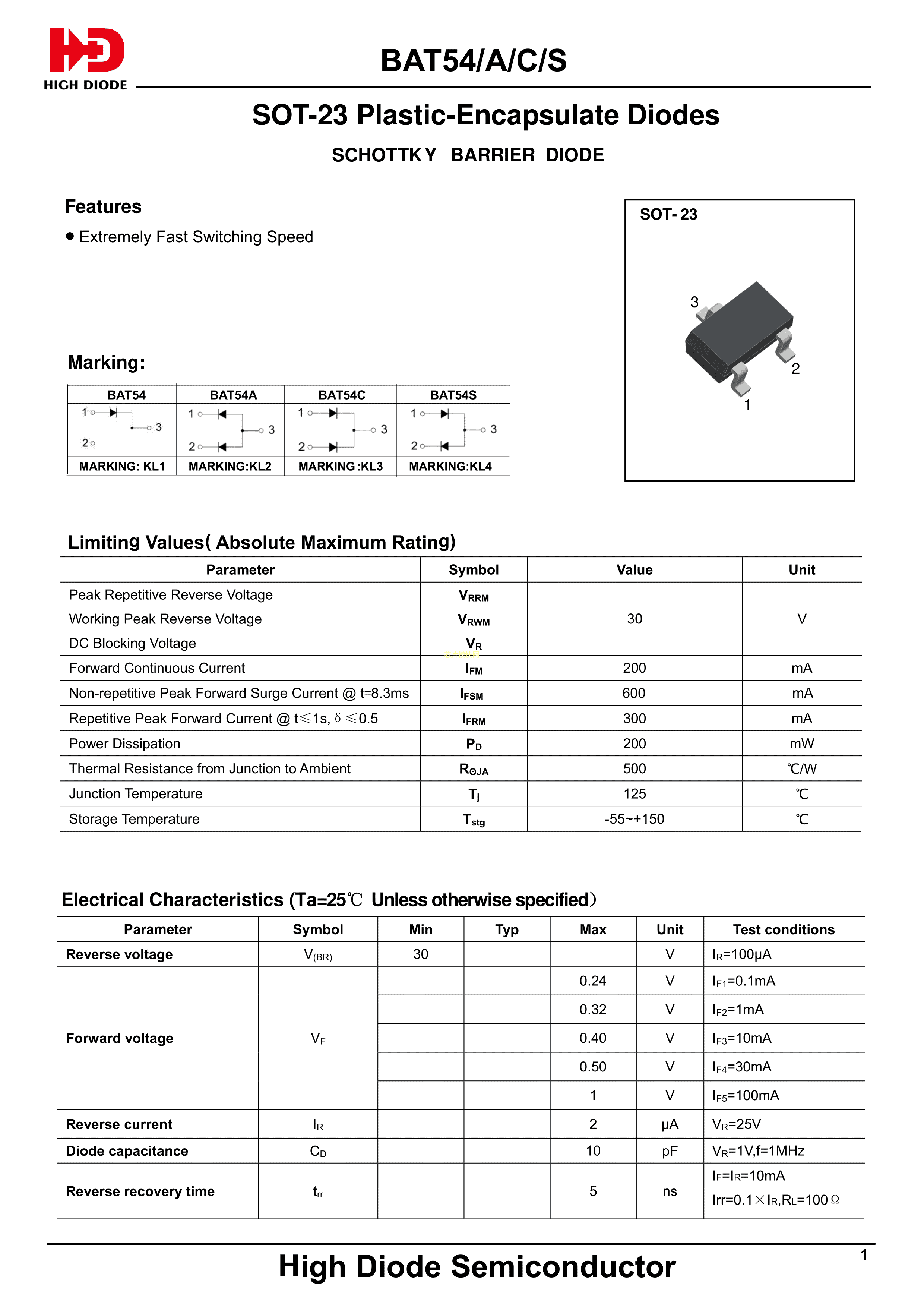 BAT54S数据手册SOT-23封装HighDiode(海德)PDF规格书,中英文下载
