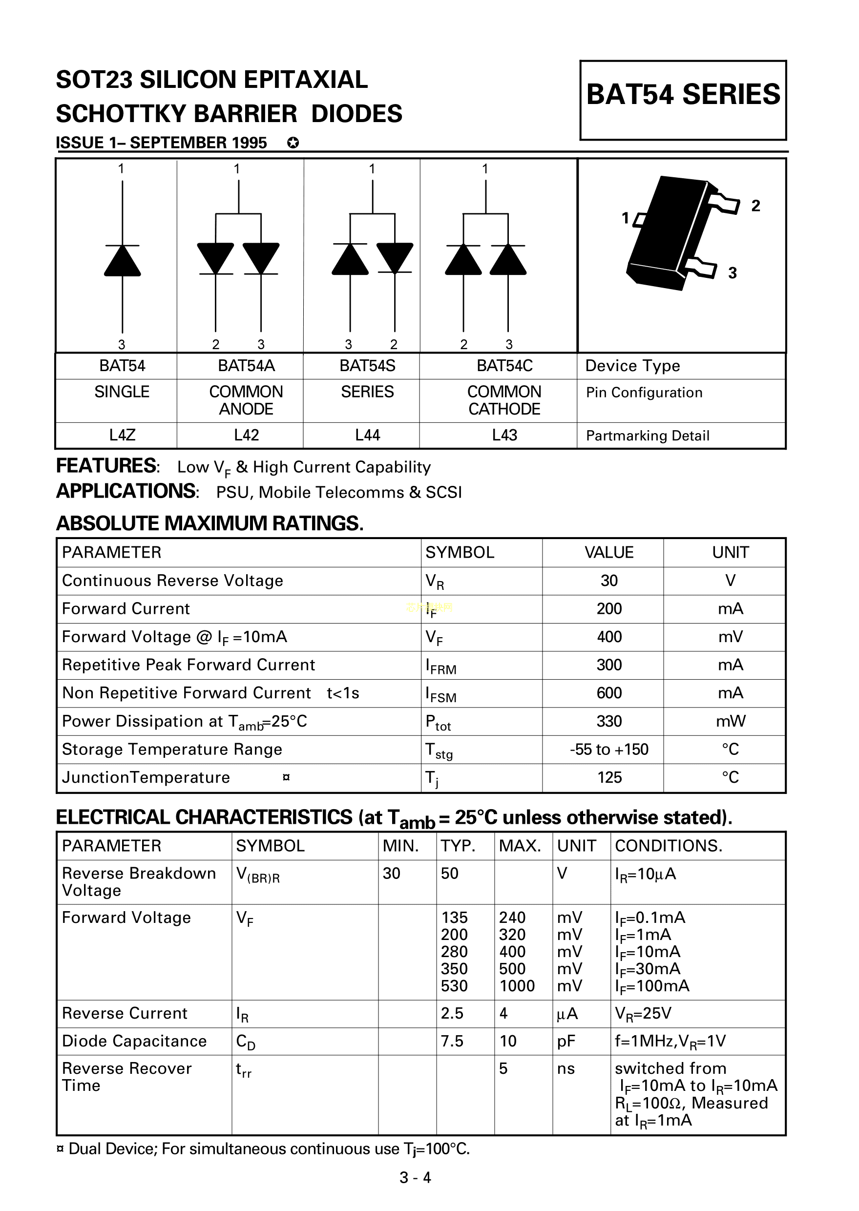 BAT54TA数据手册SOT-23封装DIODES(美台)PDF规格书,中英文下载