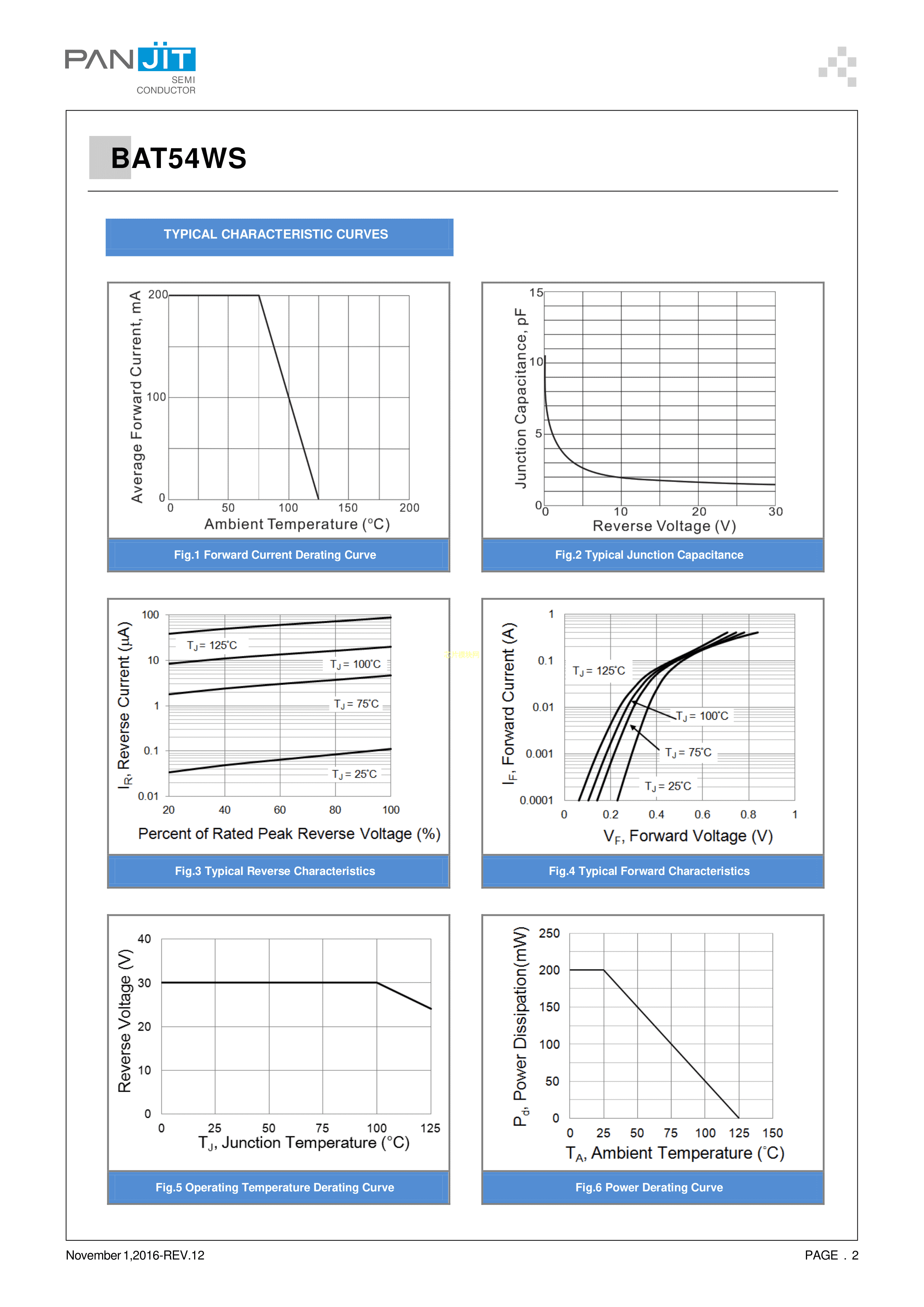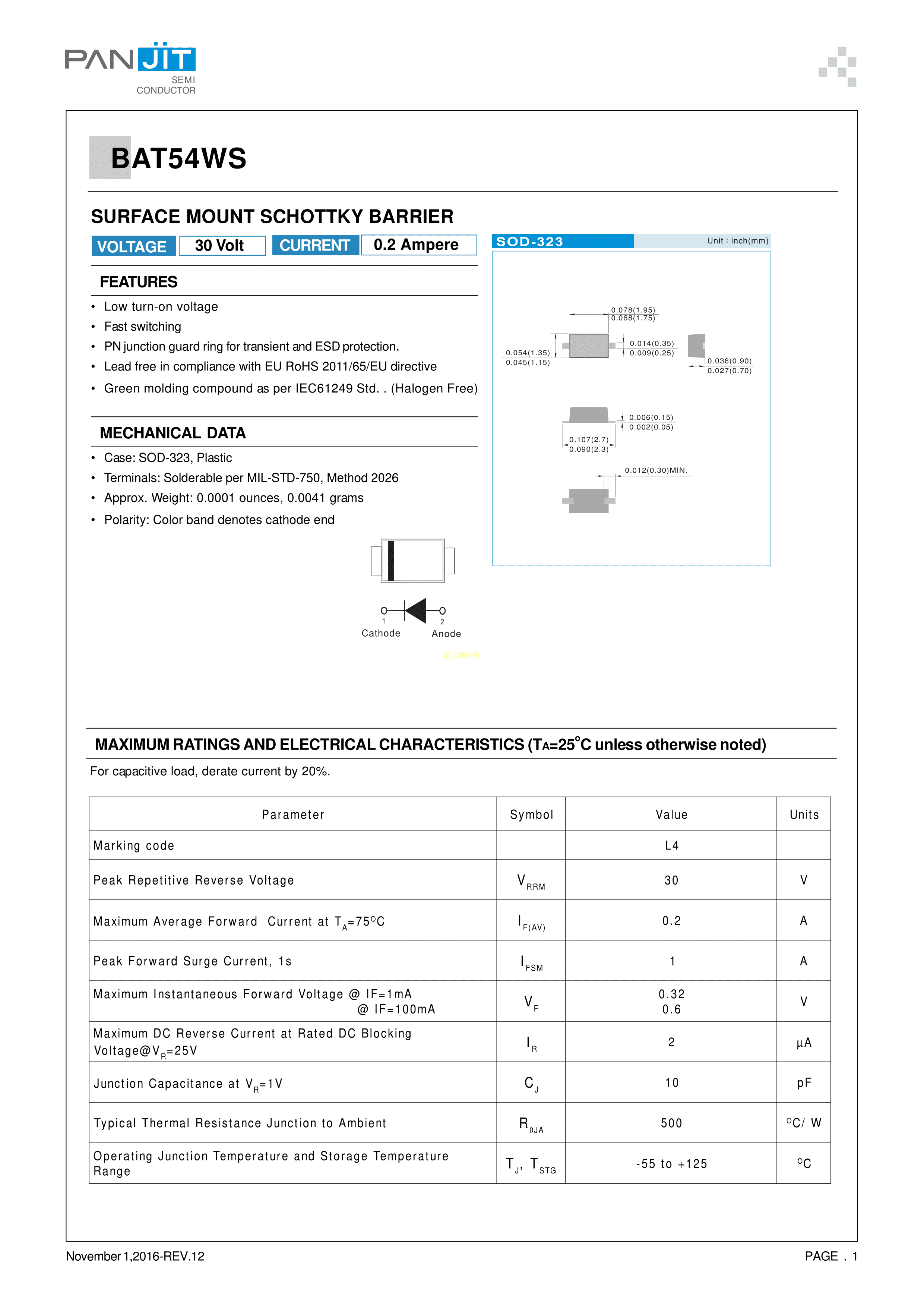 BAT54WS数据手册SOD-323封装PANJIT(强茂)PDF规格书,中英文下载