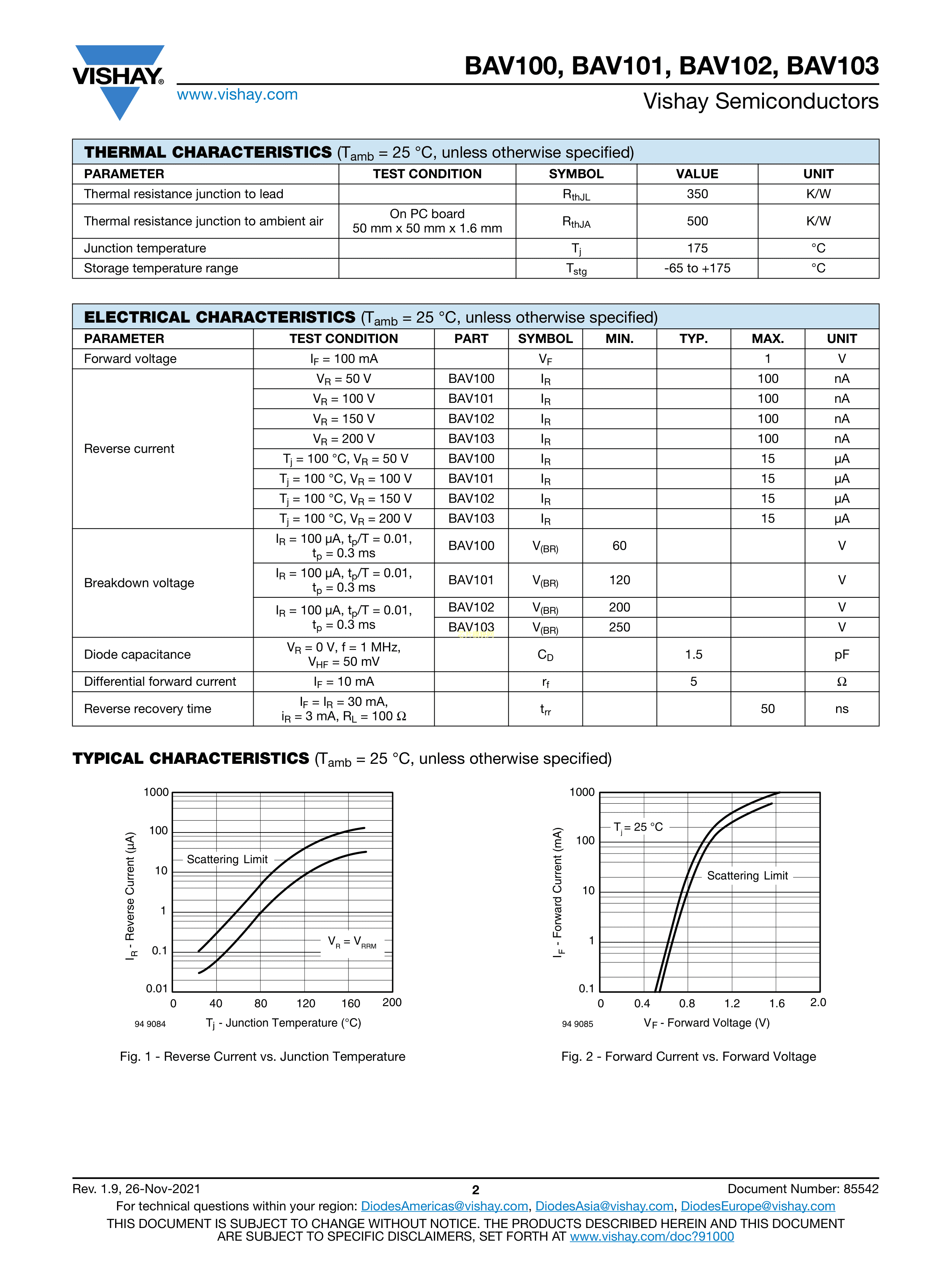 BAV100-GS08数据手册SOD-80封装VISHAY(威世)PDF规格书,中英文下载