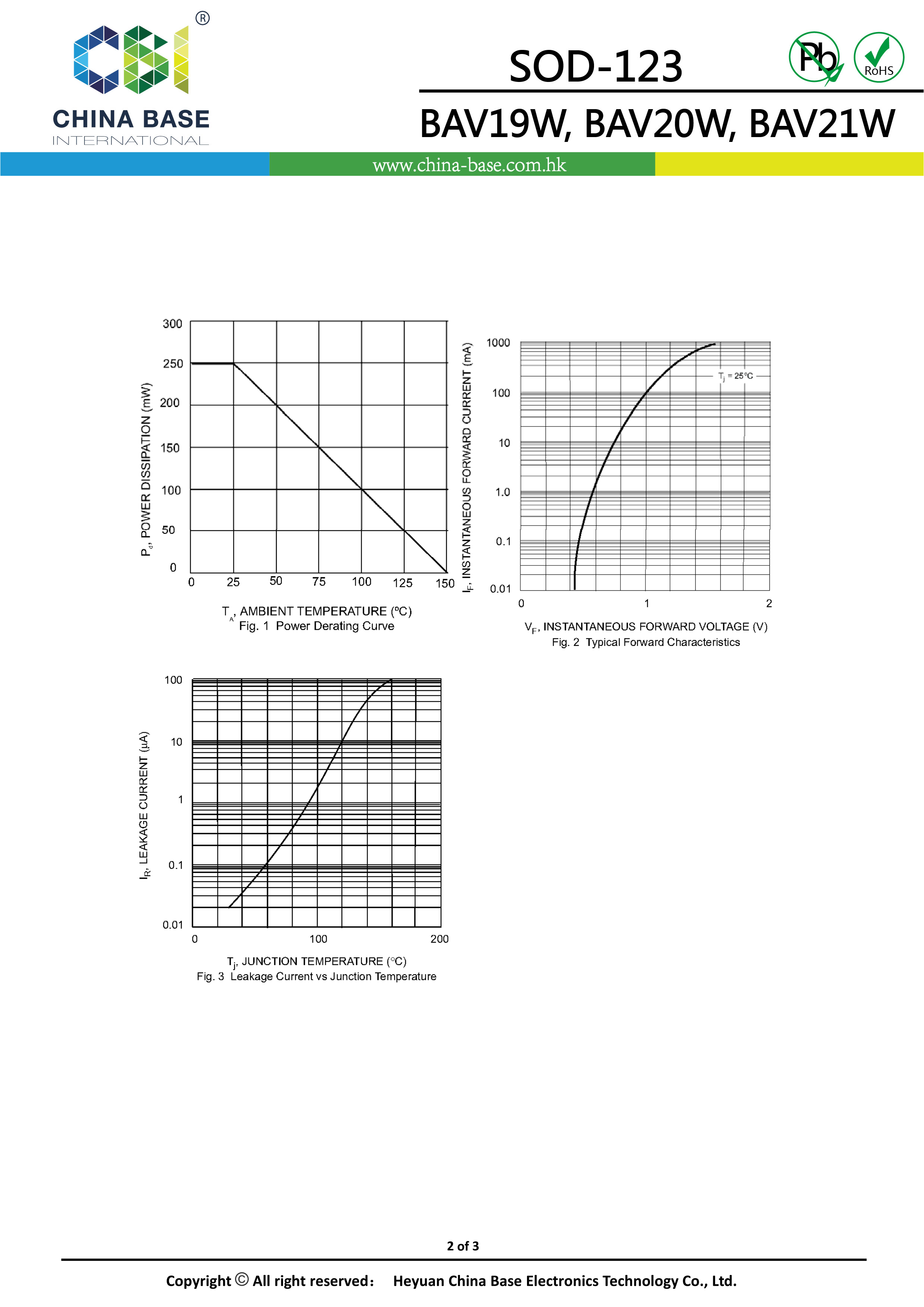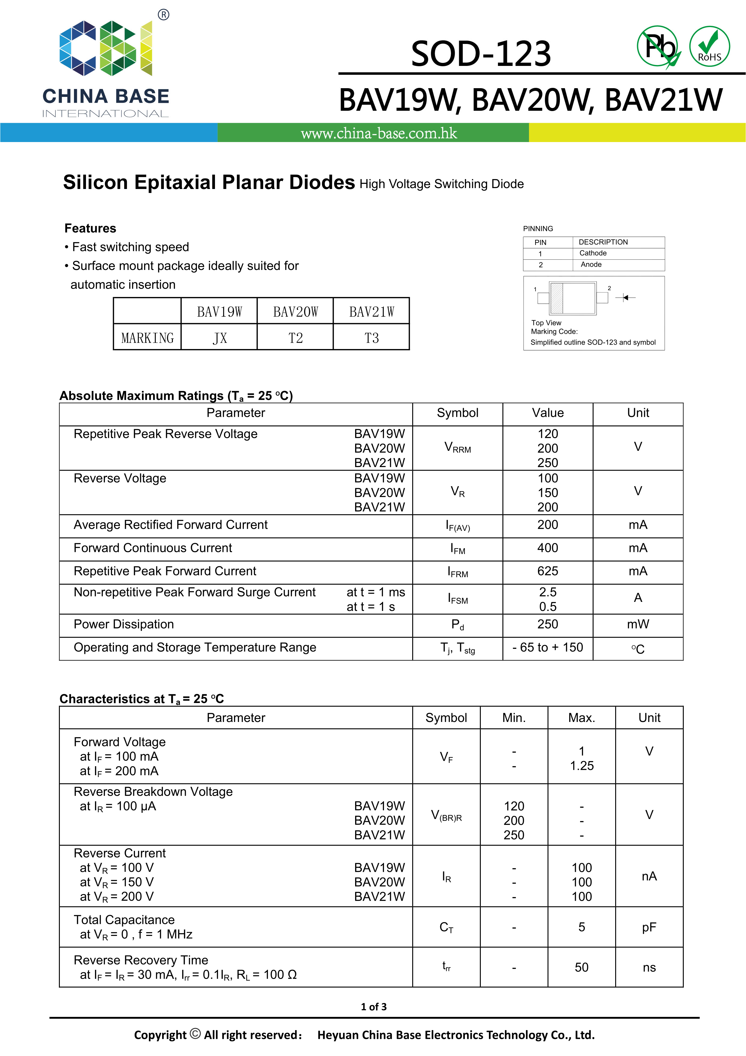 BAV21W T3数据手册SOD-123封装CBI(创基)PDF规格书,中英文下载