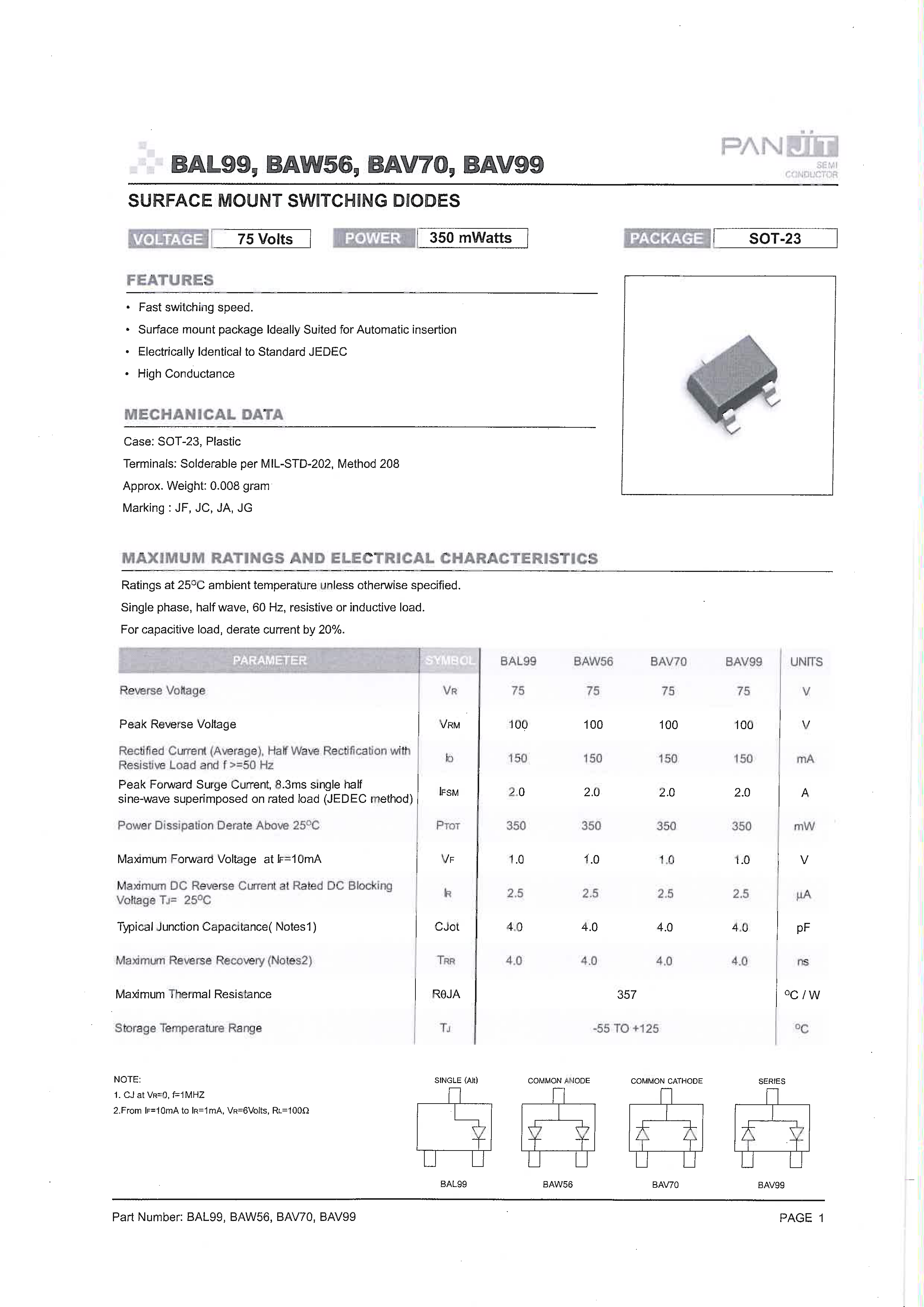 BAV99_R1_000Z9数据手册SOT-23封装PANJIT(强茂)PDF规格书,中英文下载