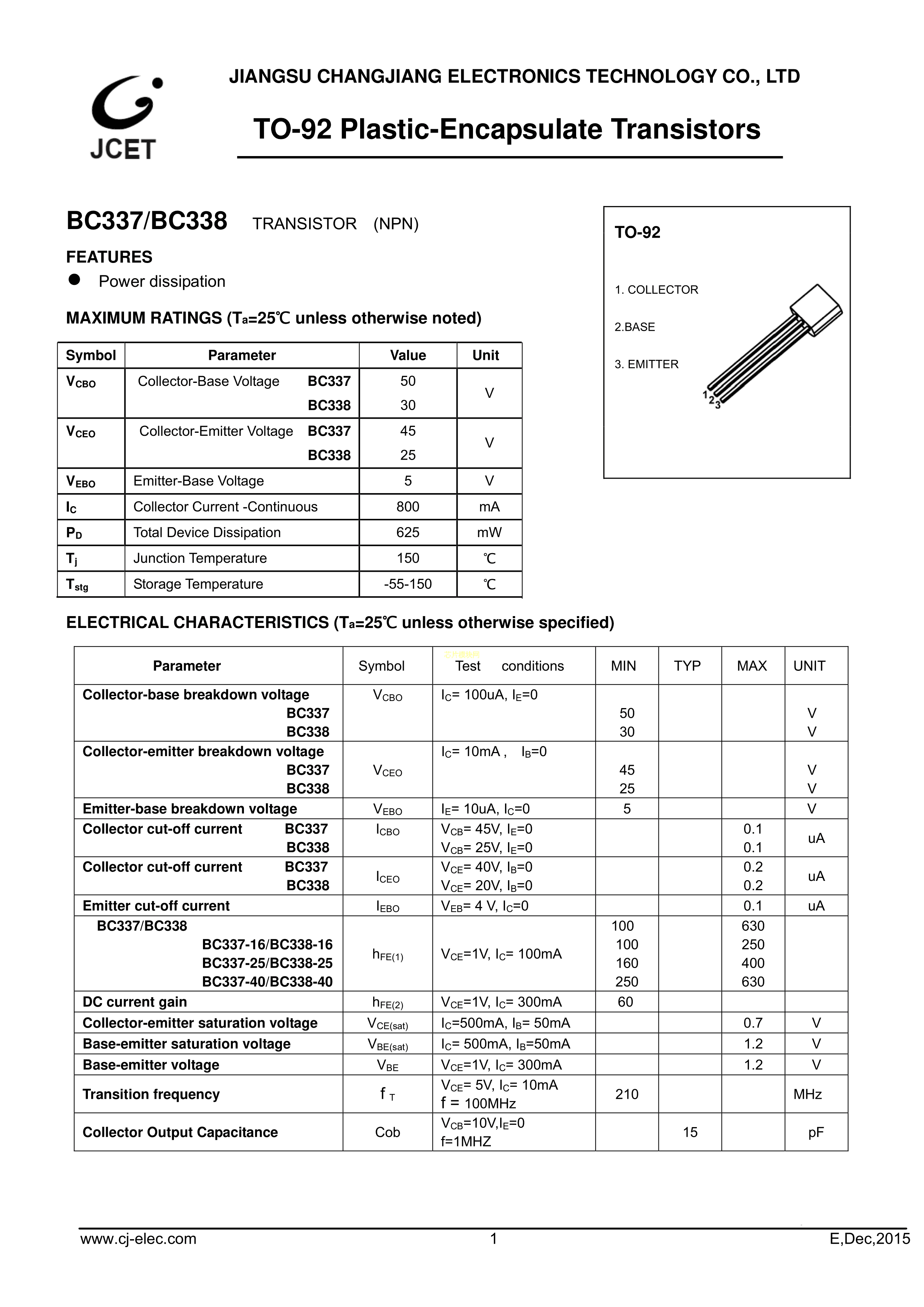 BC337-25-TA数据手册TO-92_Forming1封装CJ(江苏长电-长晶)PDF规格书,中