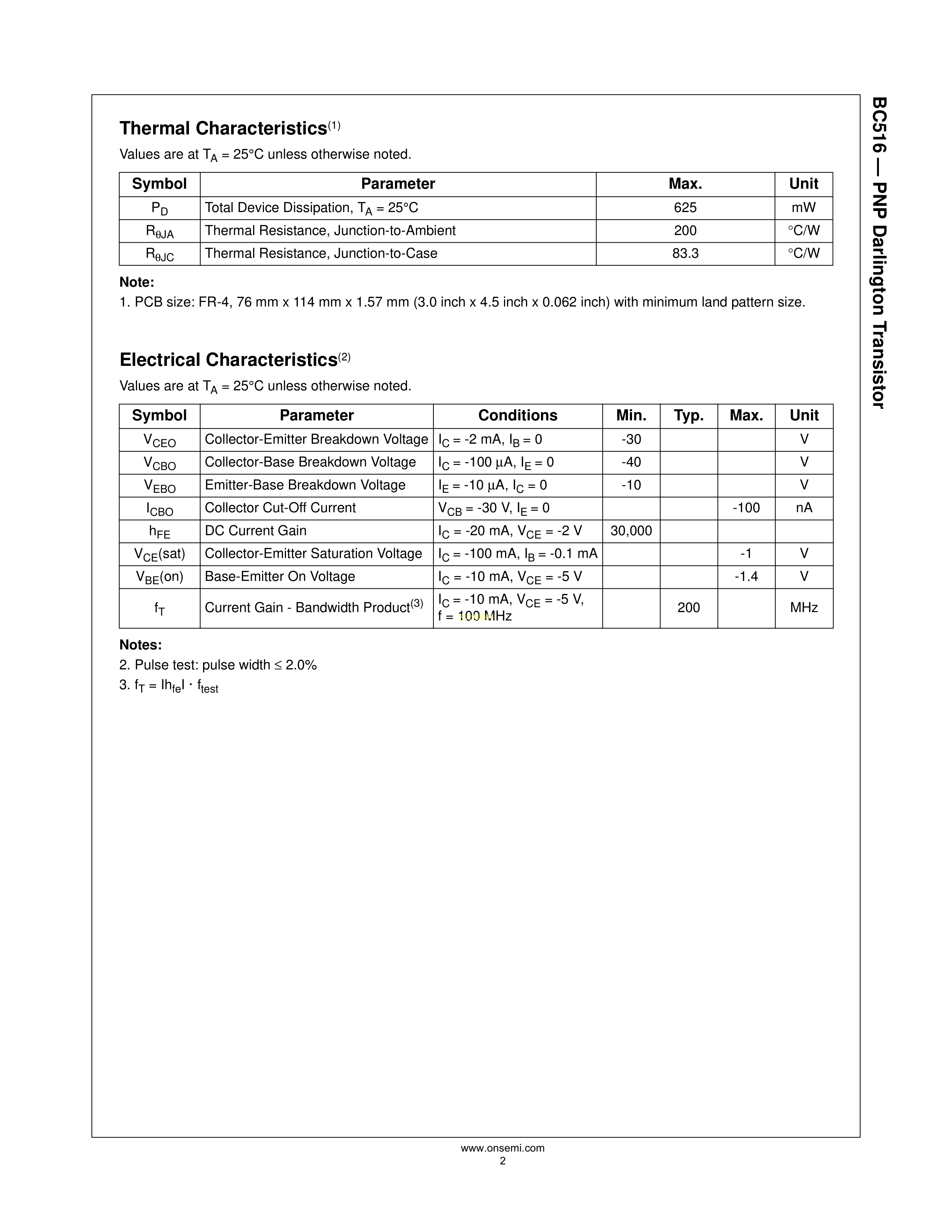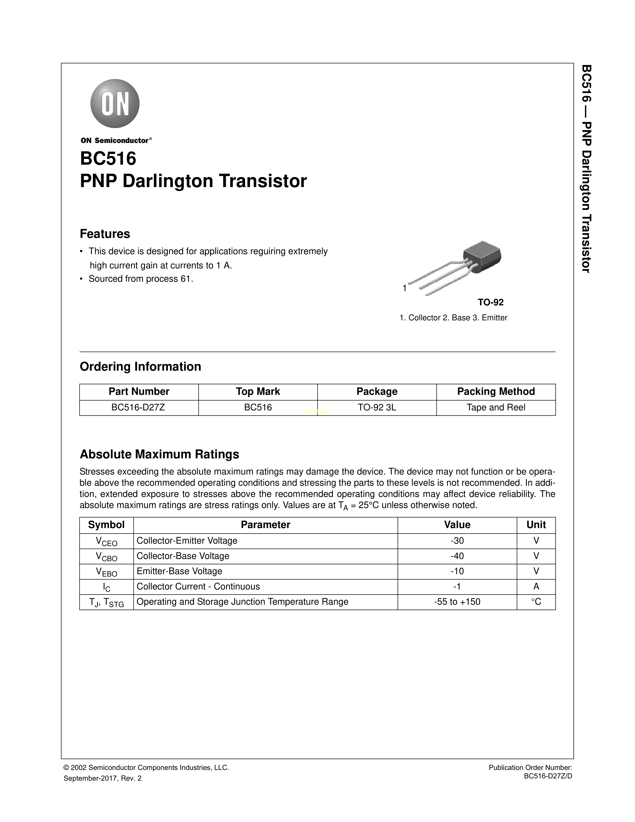 BC516-D27Z数据手册TO-92-3L封装onsemi(安森美)PDF规格书,中英文下载