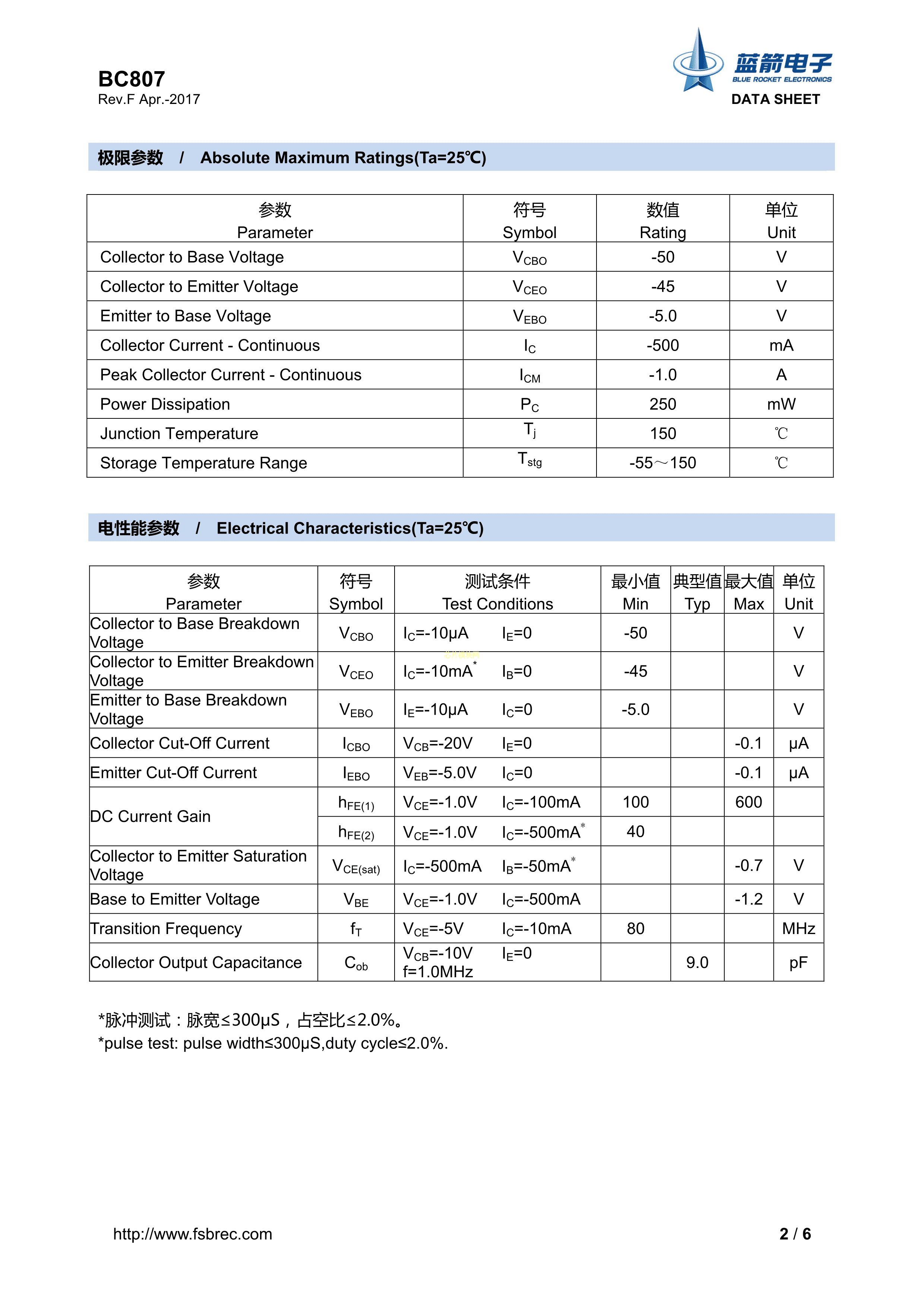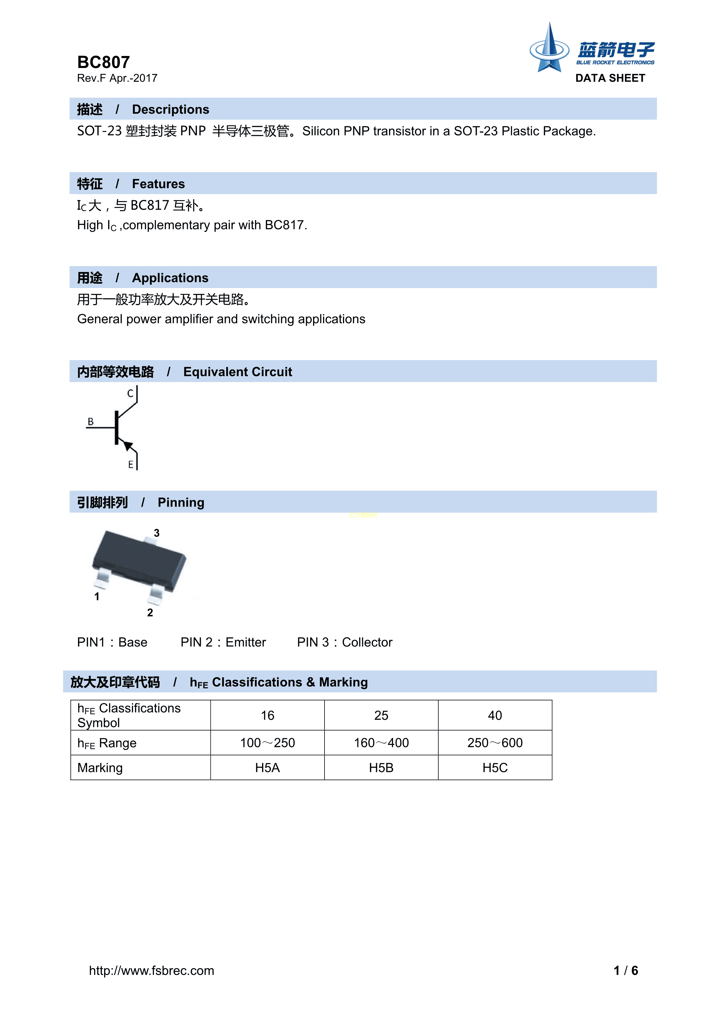 BC807-25数据手册SOT-23封装BLUEROCKET(蓝箭)PDF规格书,中英文下载