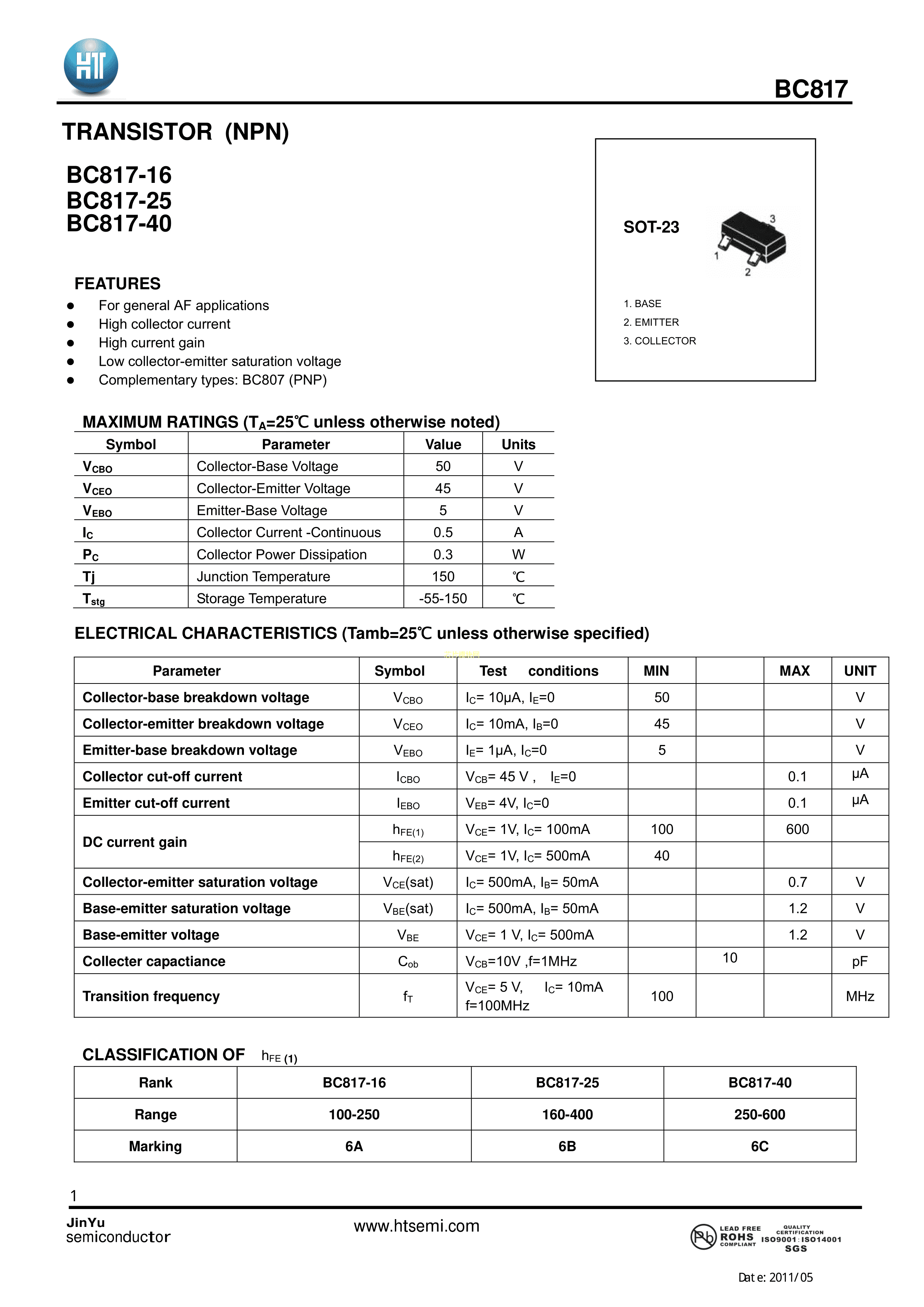 BC817-25数据手册SOT-23封装HT(金誉)PDF规格书,中英文下载